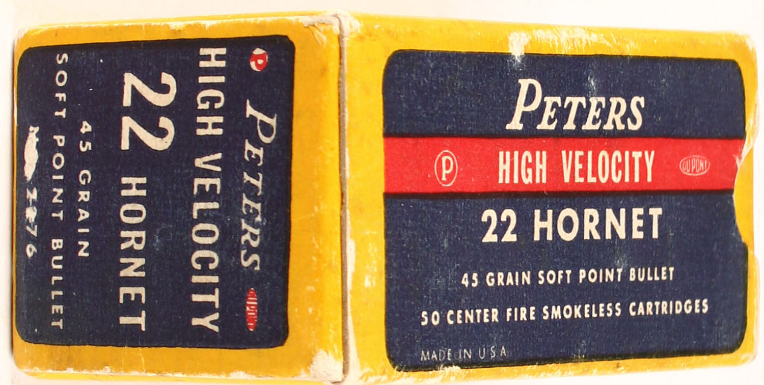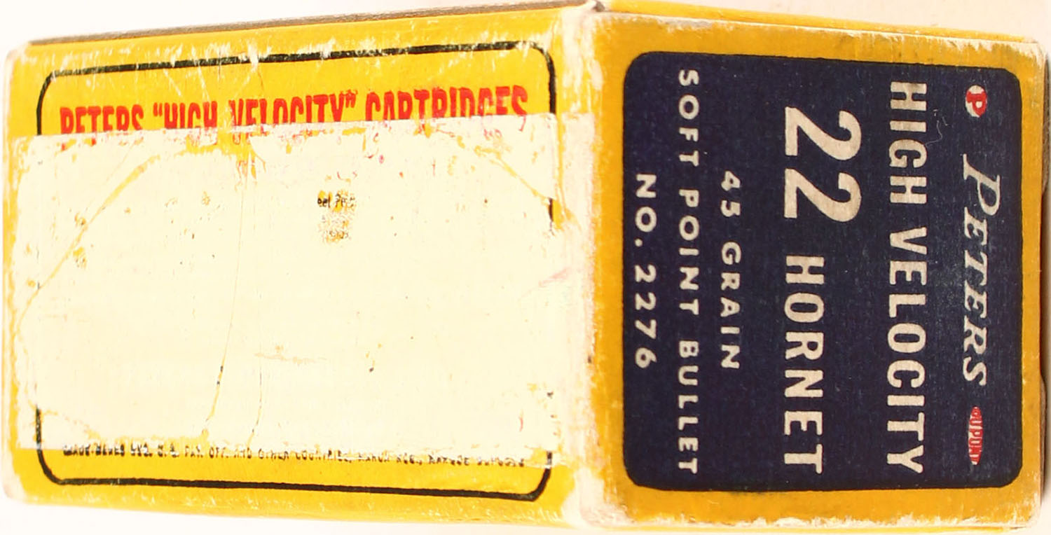 Peters, High Velocity, .22 Hornet, 45 Gr. Soft point bullet, smokeless, 1pc, Full, yellow box with blue/red label & white print, box is solid with white paint on bottom, pen marks, rub marks, & light edge/corner wear, ammo is excellent. Grade: Very Good ++ - Value: 50 to 150