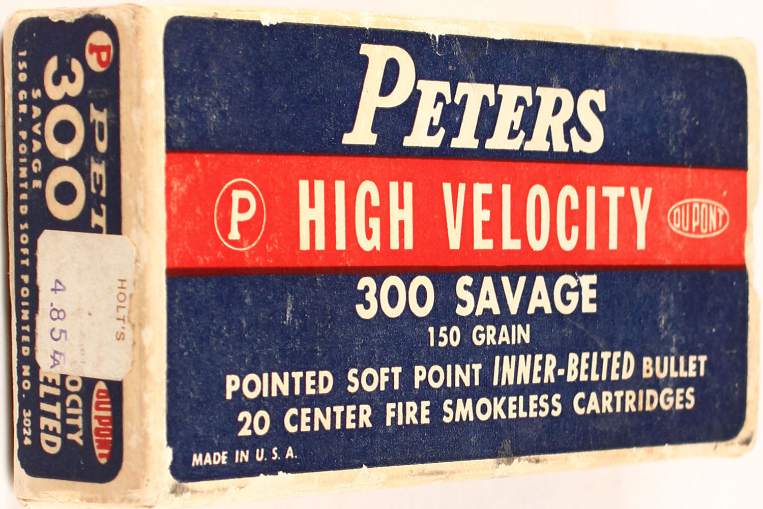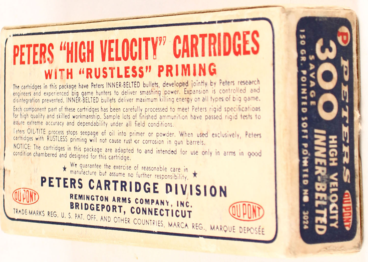 Peters, High Velocity, .300 Savage, 150 Gr. Pointed soft point Inner-Belted Bullet, smokeless, 1pc, Full with incorrect H/S, white box with blue/red label & white print, box is solid with sticker on left end flap, light age soiling, light rub marks, & light edge/corner wear, ammo is excellent. Grade: Very Good ++ - Value: 10 to 40
