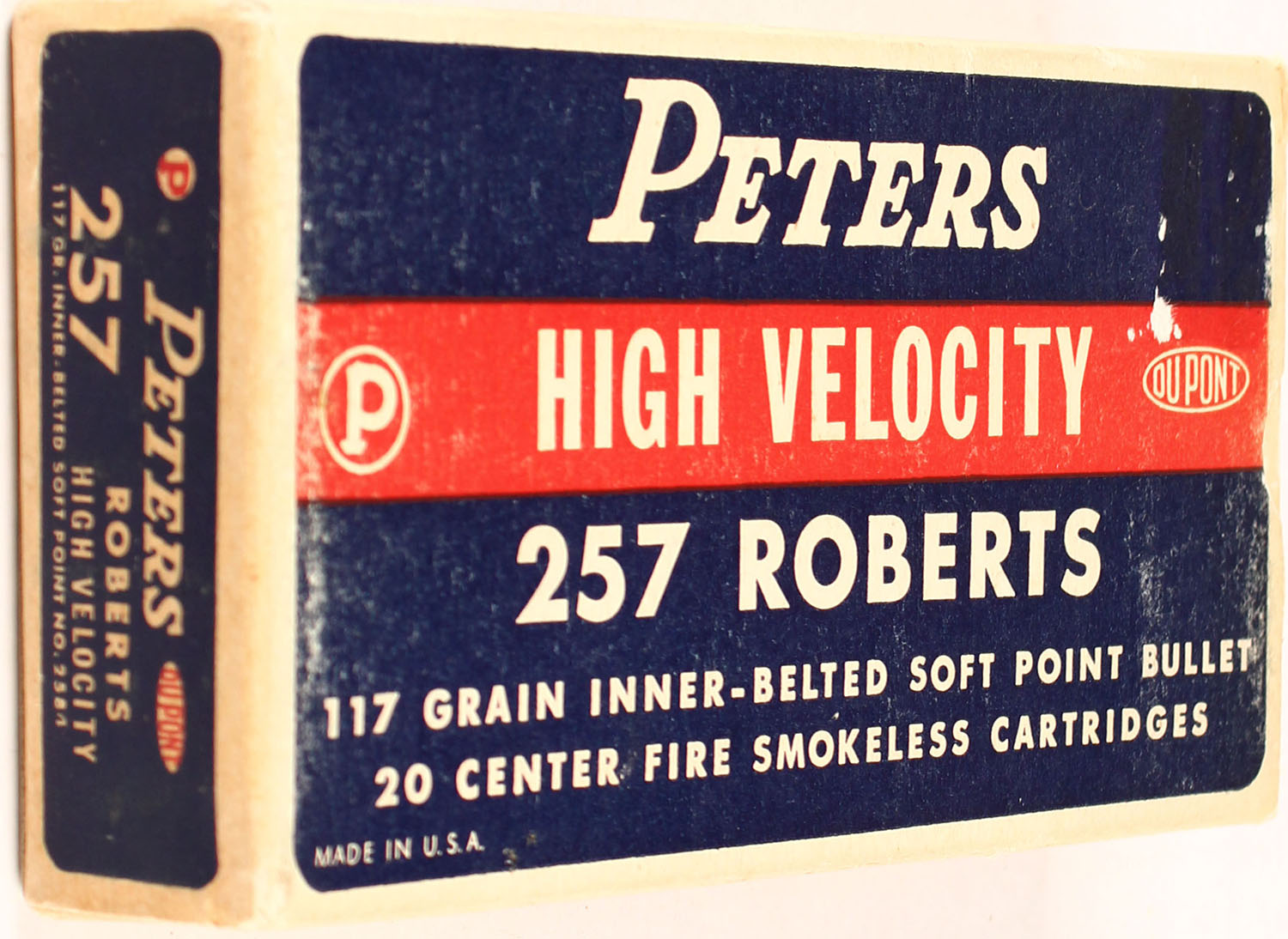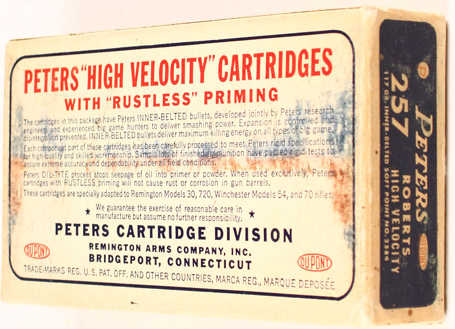 Peters, High Velocity, .257 Roberts, 117 Gr. Inner-Belted soft point bullet, smokeless, 1pc, Full, white box with blue/red label & white print, box is solid with rub marks, & light edge/corner wear, ammo is excellent. Grade: Excellent - Value: 40 to 120