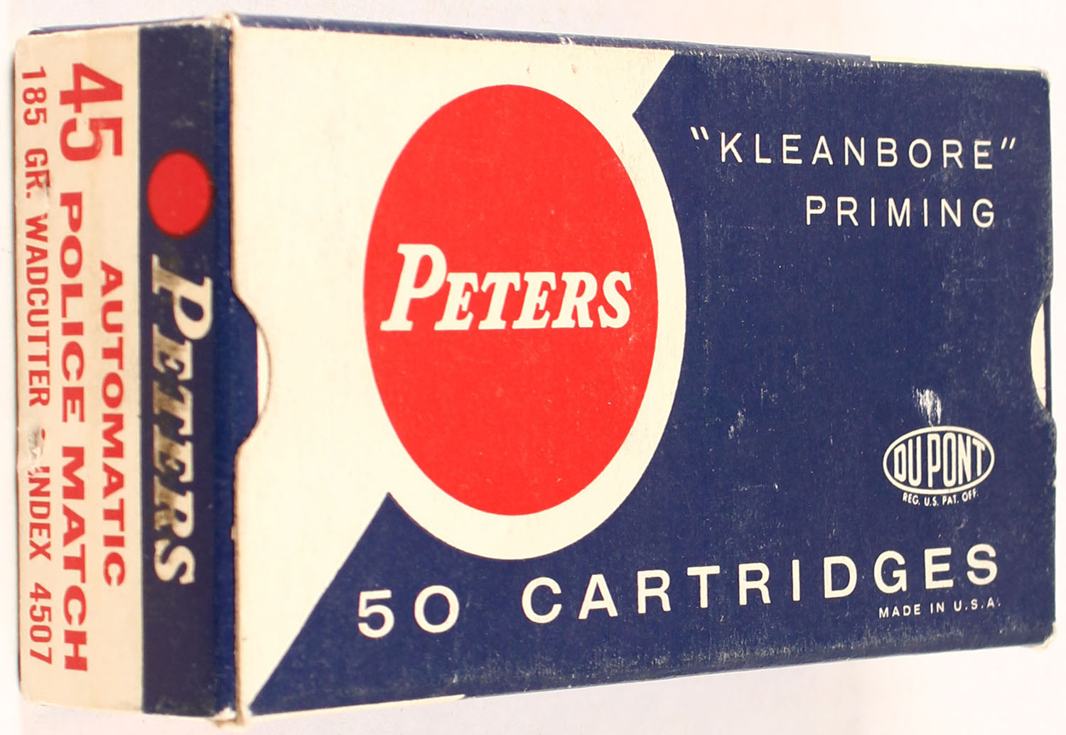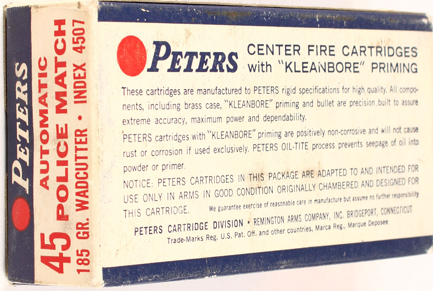 Peters, .45 Automatic, Police match, 185 Gr. Wadcutter, 1pc, Full, white/blue/red box with white/blue/red print, box is solid with light rub marks, & light edge wear, ammo is Excellent. Grade: Excellent - Value: 30 to 90