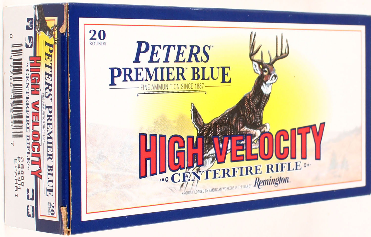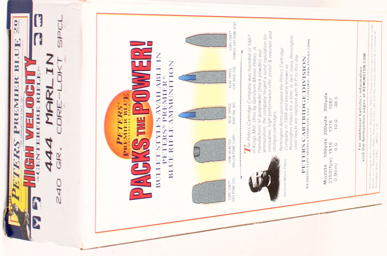 Peters, Premier Blue High Velocity, .444 Marlin, 240 Gr. Core-Lokt SPCL, 1pc, Full, white/blue box with red/blue/black print, box is solid with little wear, ammo is MINT. Grade: Excellent ++ - Value: 60 to 180