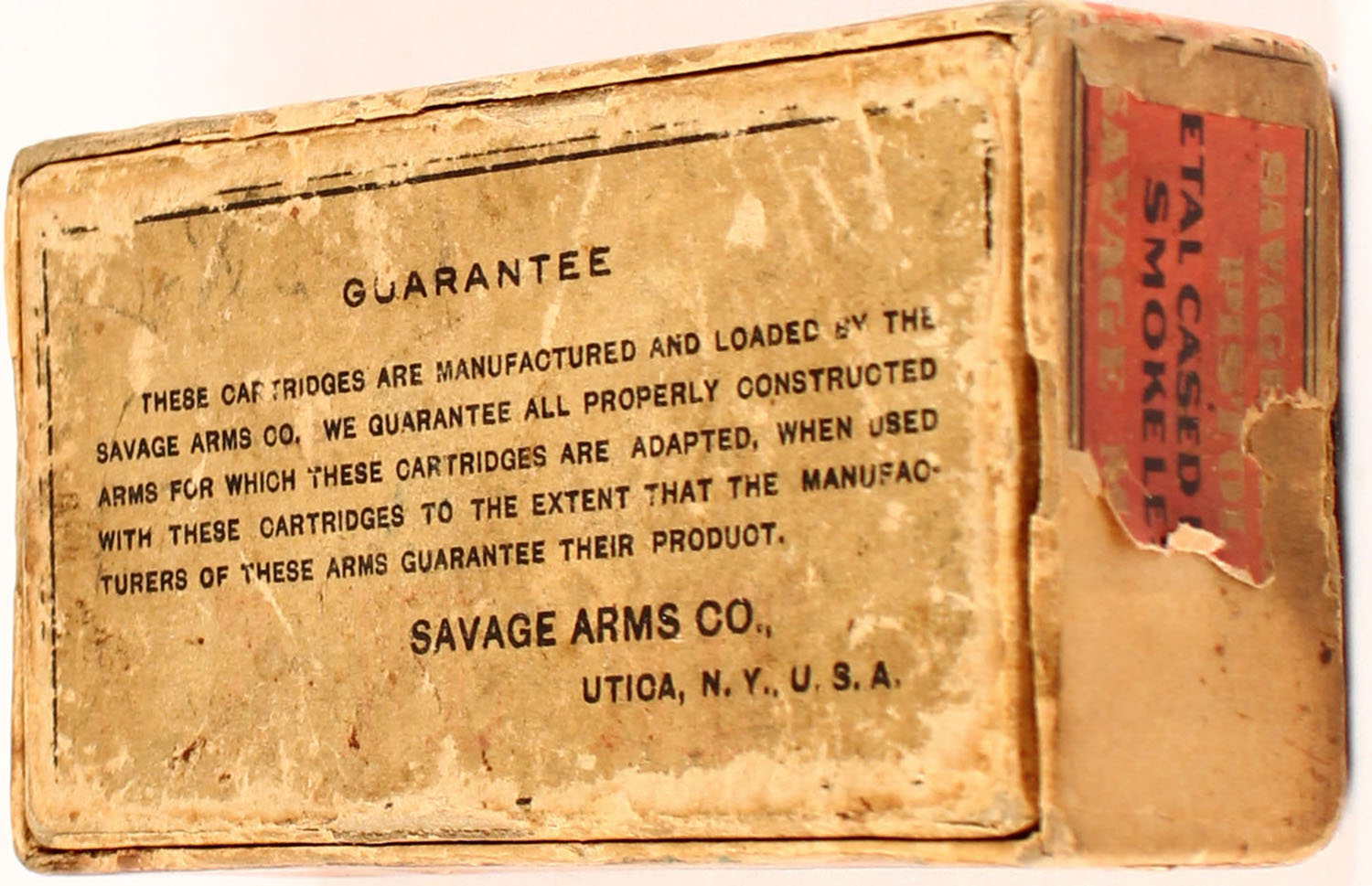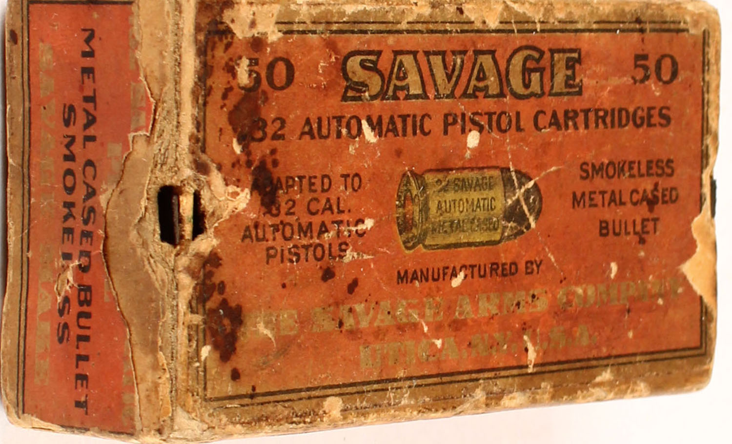 Savage, .32 Automatic, Metal Cased Bullet, Smokeless, 2pc, empty, buff box with red label & black print, box is solid with age soiling, tear in right end label, rub marks, & edge wear. Grade: Very Good + - Value: 20 to 100