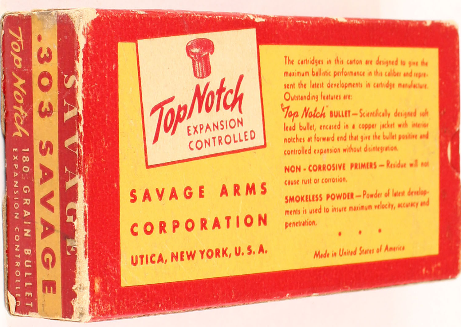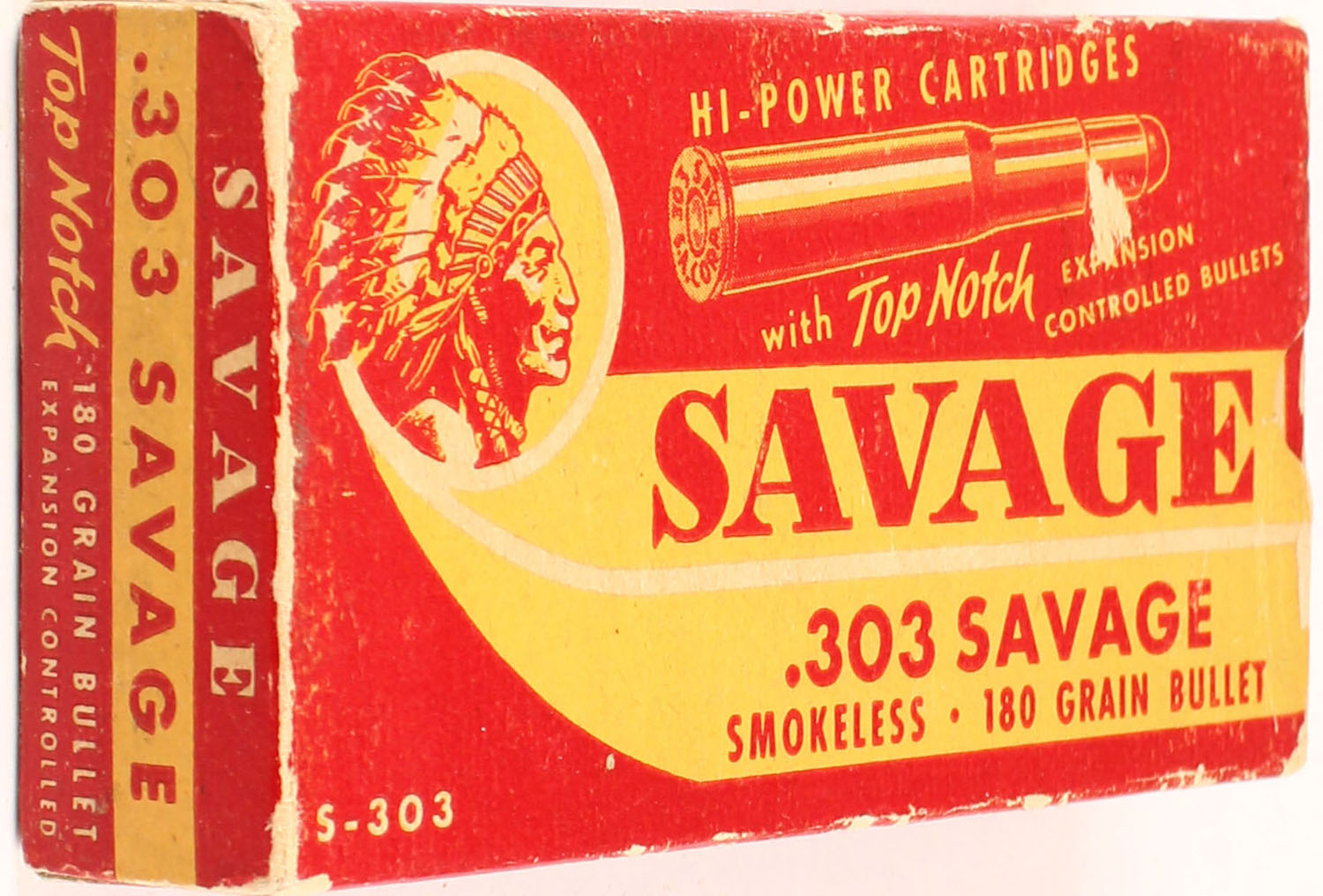 Savage, .303 Savage, 180 Gr. Soft point Expansion controlled bullet, smokeless, 1pc, Full, red box with yellow label & red/yellow print, box is solid with rub marks & edge wear, ammo ranges from excellent to very good with one Rd. with corrosion. Grade: Excellent - Value: 80 to 160
