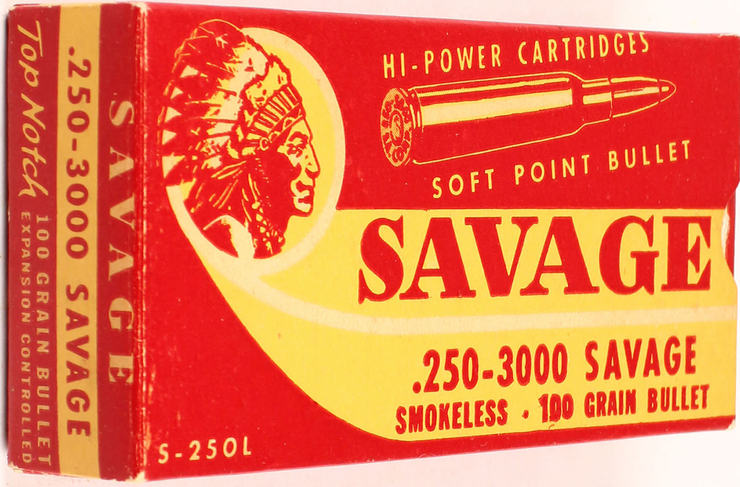 Savage, .250-3000 Savage, 100 Gr. Soft Point Bullet, smokeless, 1pc, Full, red box with yellow label & red/yellow print, box is solid with light rub marks, ammo is excellent. (949) Grade: Excellent ++ - Value: 80 to 160