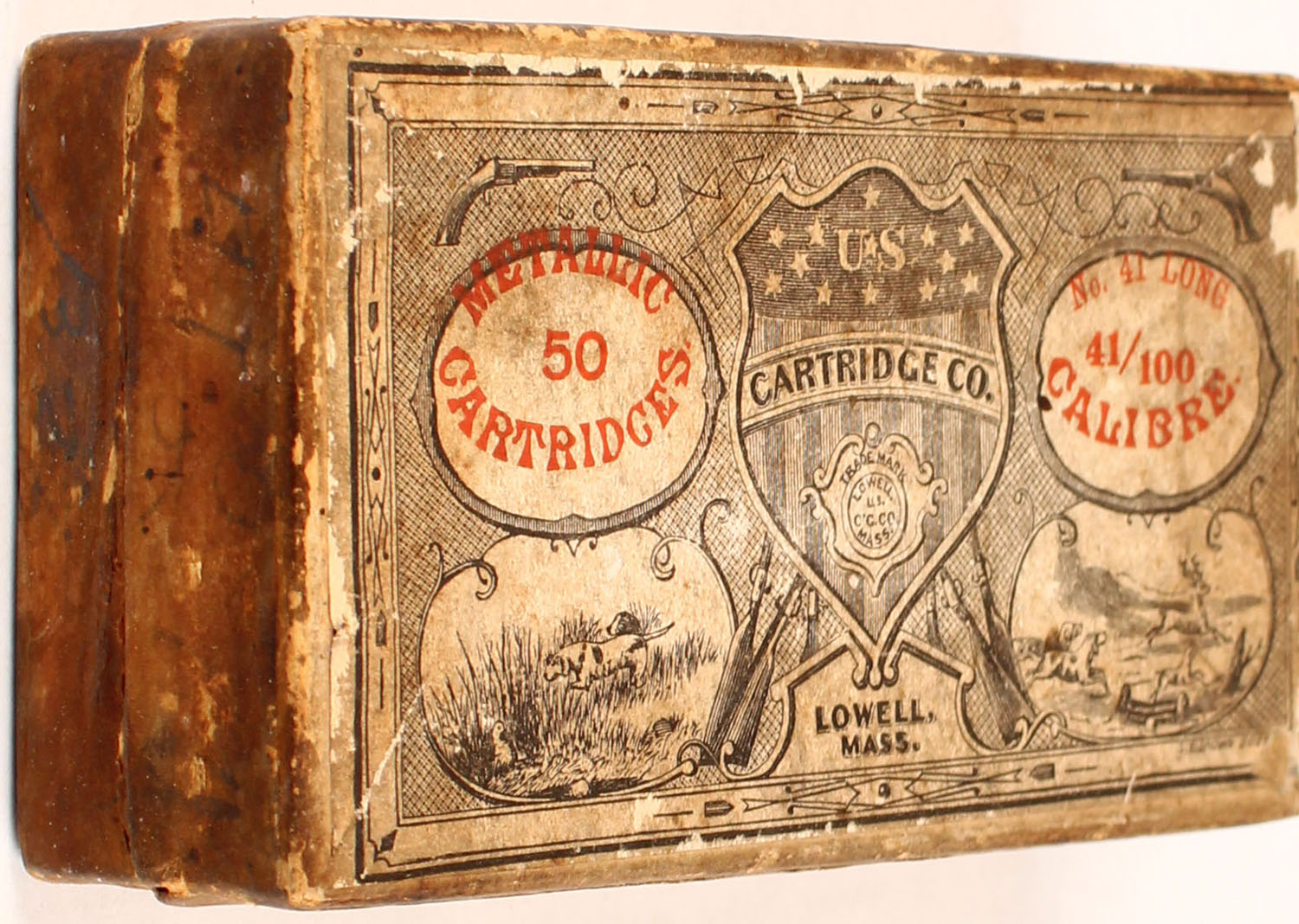 U.S. Cart. Co., .41 Long (41/100) R.F., 2pc, FULL & SEALED, buff box & label with black/red print, box is solid with age soiling, pen marks, rub marks, & edge wear. Grade: Very Good + - Value: 80 to 160