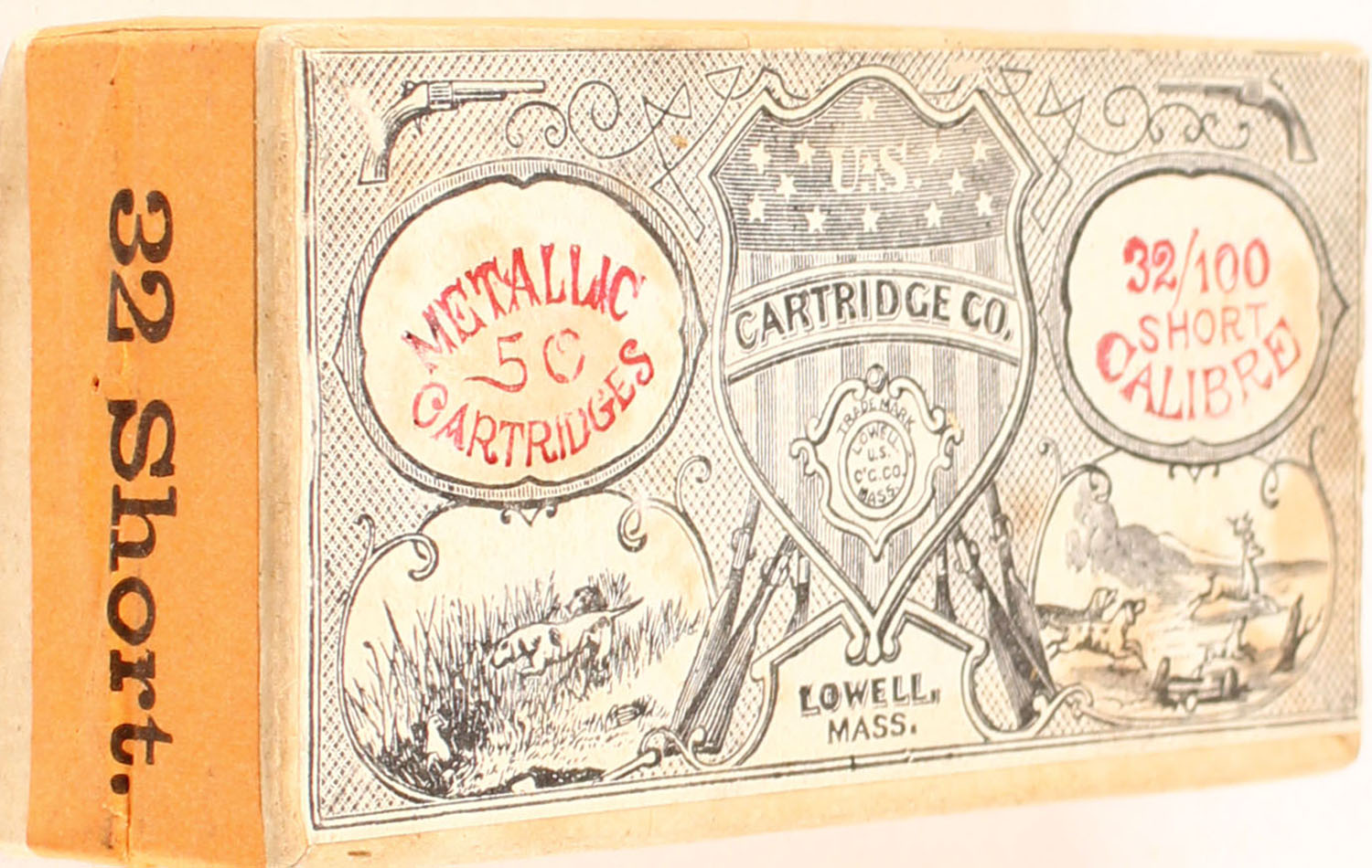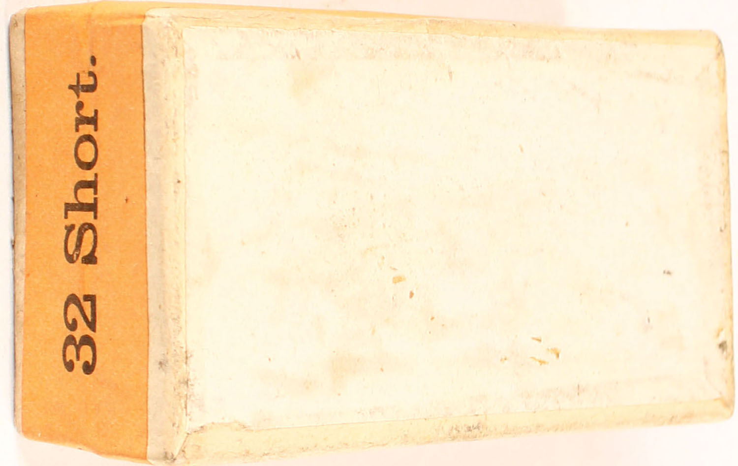 U.S. Cart. Co., .32 Short (32/100) R.F., target cartridges, 2pc, FULL & SEALED, buff box with buff/orange label & black/red print, box is solid with excellent color, light staining, light rub marks, & light edge wear. Grade: Excellent + - Value: 100 to 200