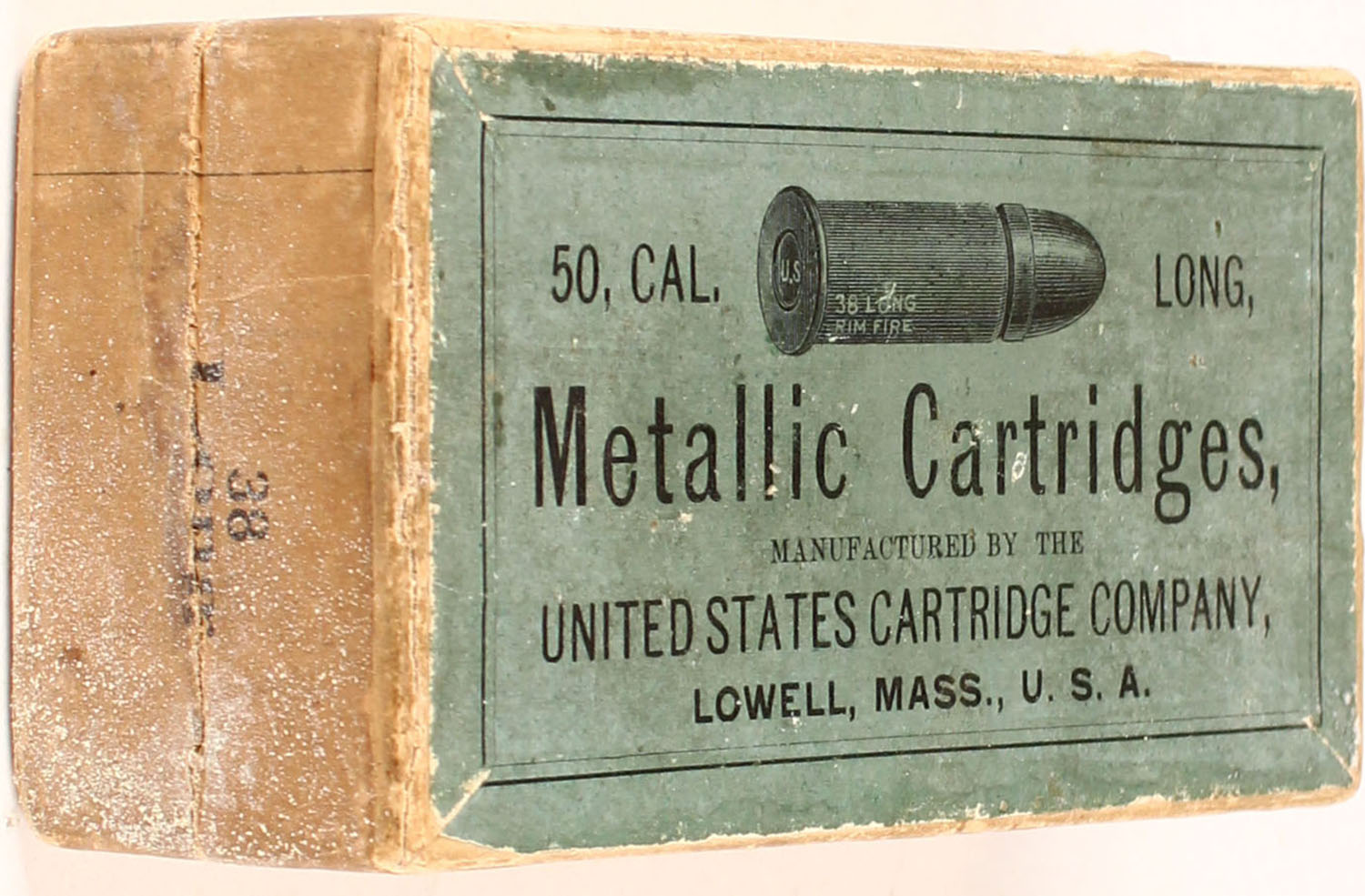 U.S. Cart. Co., .38 Long R.F., target cartridges, 2pc, FULL & SEALED, buff box with blue label & black print, box is solid with faint pencil marks on bottom, rub marks, & light edge/corner wear. Grade: Excellent - Value: 50 to 300