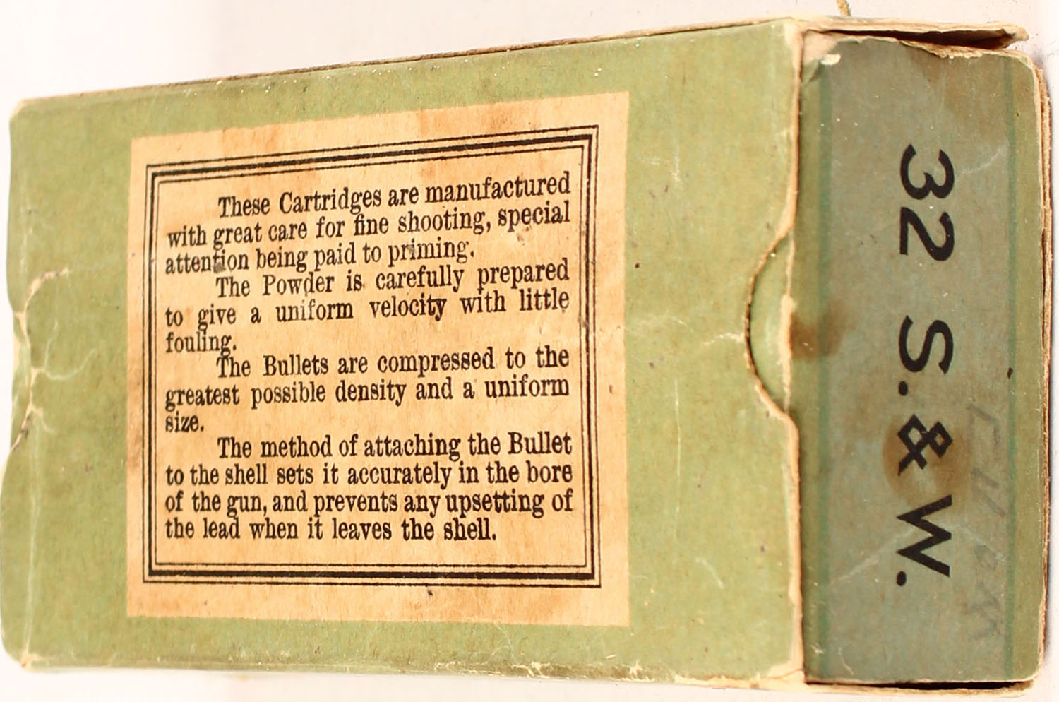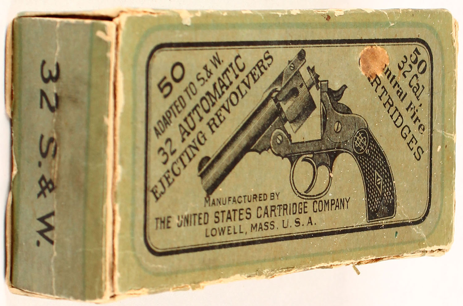 U.S. Cart. Co., .32 S.&W., 1pc, Full half newer with H/S half without, green box with black print, box has both end slaps detached, partial tear in one seam, light age soiling, light rub marks & light edge wear, ammo is very good. Grade: Very Good - Value: 20 to 60