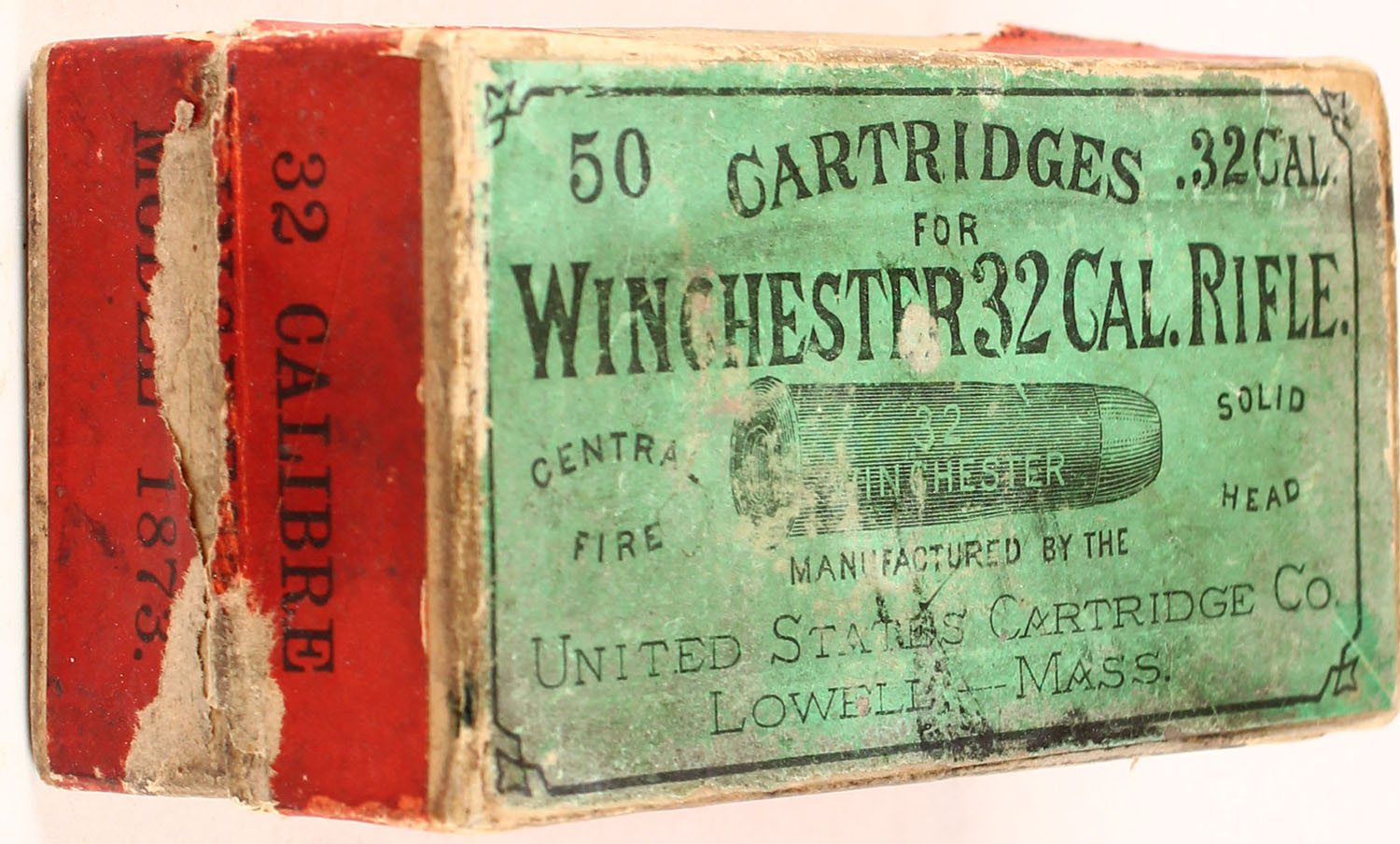 U.S. Cart. Co., .32 Winchester, Solid Head, 2pc, Partial 11 Rds., buff box with green/red label & black print, box is solid with tears in side label, tub marks & edge/corner wear, ammo is good. Grade: Very Good + - Value: 24 to 300