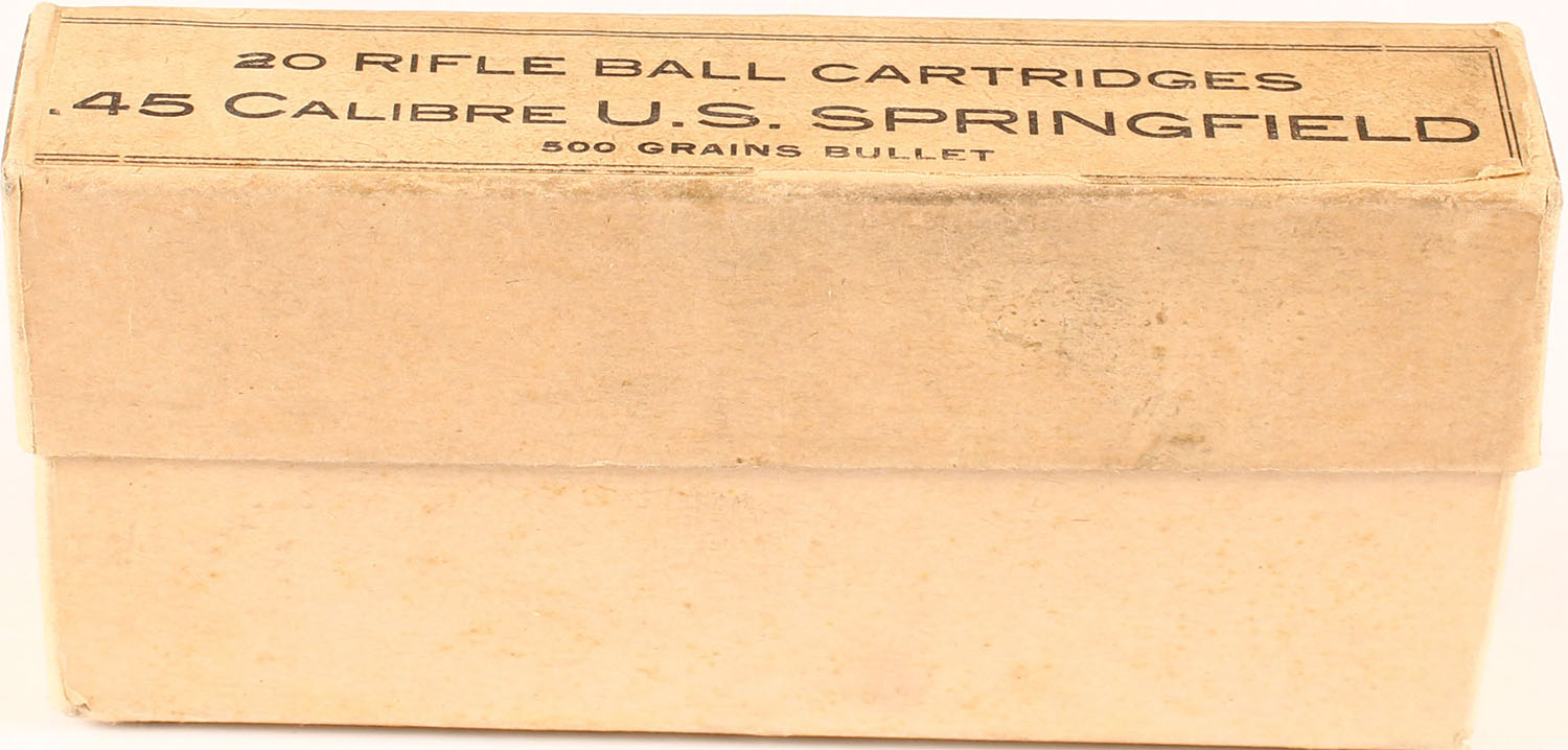 U.S. Cart. Co., .45 Calibre U.S. Springfield, 500 Gr. Bullet, 2pc, Full, buff box & black print, box is solid with little to no wear, ammo ranges from excellent to very good. Grade: MINT - Value: 30 to 90