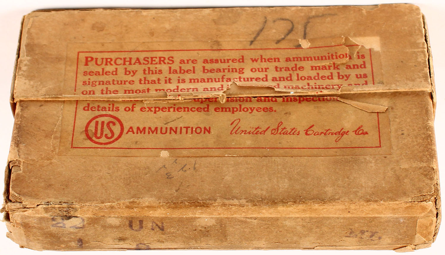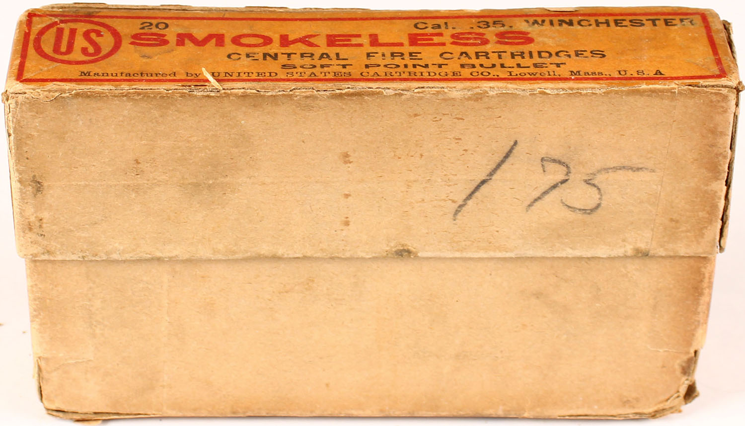 U.S. Cart. Co., .35 Winchester, Smokeless, Central Fire, Soft Point Bullet, 2pc, Full, buff box with yellow label & red/black print, box has multiple seam splits, inside seam repairs, age soiling, pencil marks, rub marks & edge wear, ammo ranges from excellent to very good. Grade: Grade: Very Good + - Value: 20 to 60
