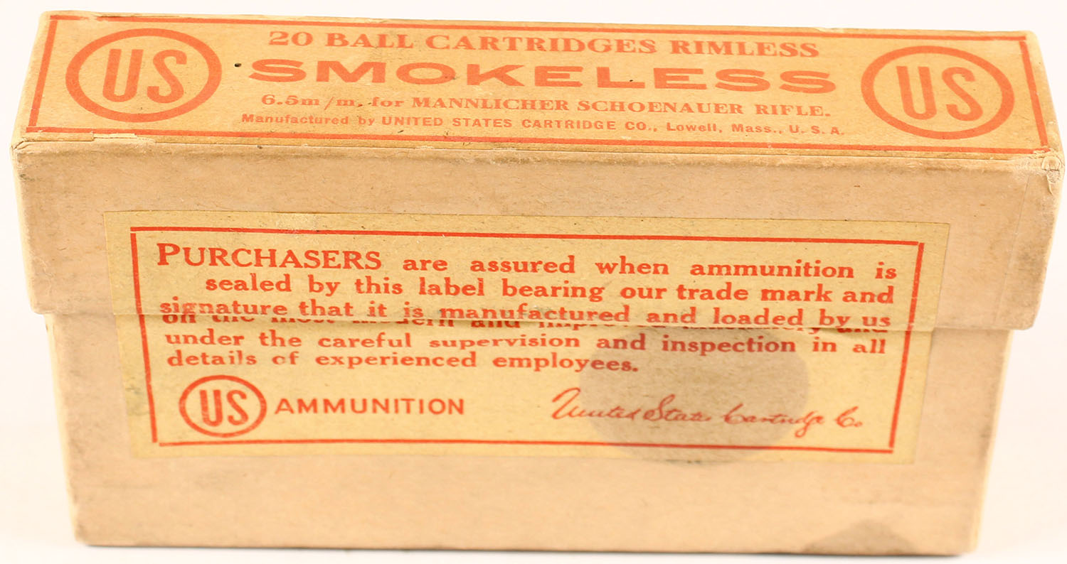 U.S. Cart. Co., 6.5mm Mannlicher Schoenauer, soft point bullets, Smokeless, 2pc, FULL & SEALED, buff box & label with red print, box is solid with stains, & light wear. Grade: Excellent + - Value: 10 to 40