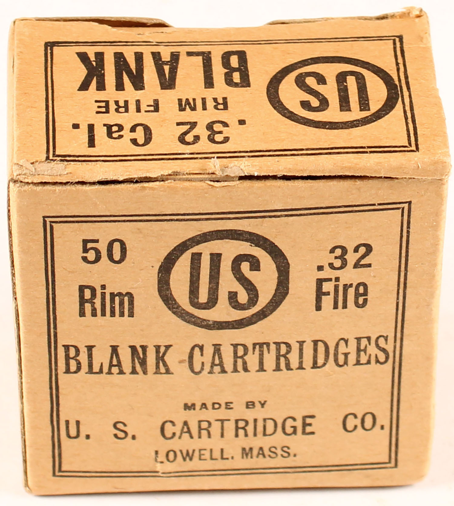 U.S. Cart. Co., .32 R.F., Blanks, 1pc, Full, buff box with black print, box has top flap & one inside flap detached, & has light handling wear, ammo is very good. Grade: Very Good ++ - Value: 10 to 30