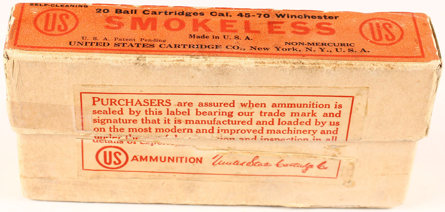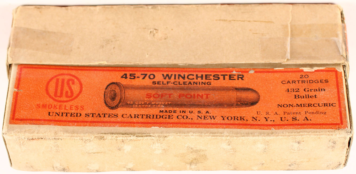 U.S. Cart. Co., .45-70 Winchester, 432 Gr. Soft point Bullet, smokeless, Non-mercuric, Self-Cleaning, 2pc, Full, buff box with orange label & black/red print, box has three taped seam repairs, one partial split seam on bottom box, light age soiling, light rub marks, & edge/corner wear, ammo is good. Grade: Very Good + - Value: 40 to 200