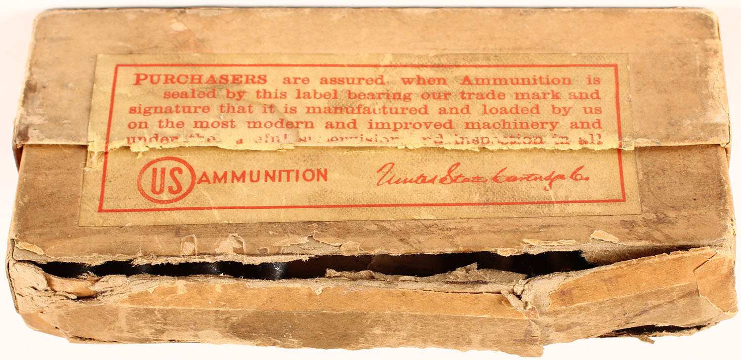 U.S. Cart. Co., .33 Winchester, soft point bullet, smokeless, 2pc, partial 18 Rds., buff box with orange/red label & black print, box has tear on bottom, chunk of box torn out of bottom, split seams, pencil marks, light age soiling, rub marks, & edge wear, ammo is very good with cracks on most cases. Grade: Good ++ - Value: 30 to 150