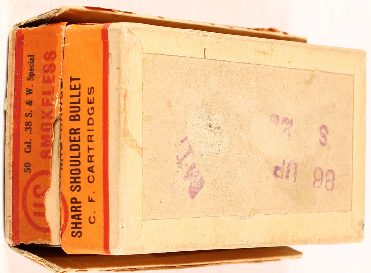 U.S. Cart. Co., .38 S.&W. Special, Mid-Range, sharp shouldered Bullet, smokeless, 2pc, Full, buff box with orange/red label & black print, box has all four corner seams split on lid, rub marks, & edge wear, ammo is very good. Grade: Very Good + - Value: 20 to 80