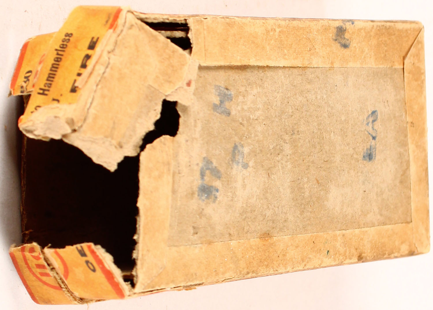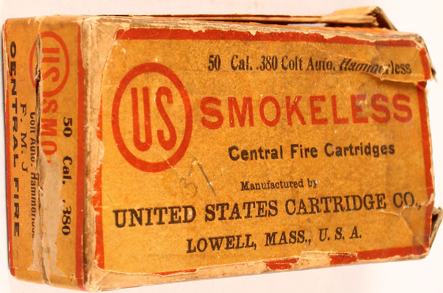 U.S. Cart. Co., .380 Colt Auto. Hammerless, Smokeless, 2pc, Partial 40 Rds., buff box with orange/red label & black print, box has hole on right end, light age soiling, pencil marks, light rub wear & edge wear, ammo is good. Grade: Good ++ - Value: 20 to 60