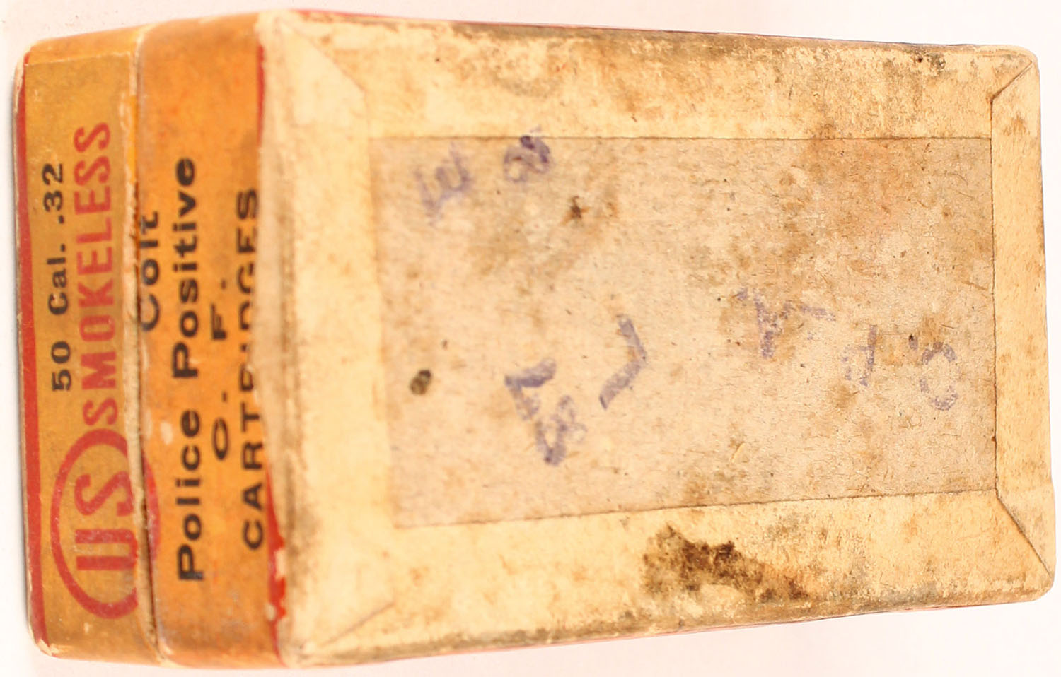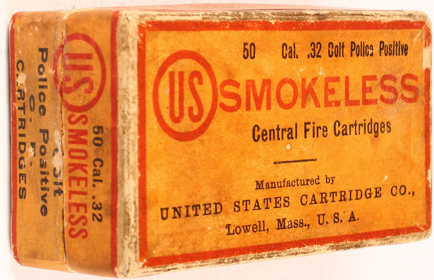 U.S. Cart. Co., .32 Colt police positive, smokeless, 2pc, Full, buff box with orange/red label & black print, box is solid with light age soiling, light rub marks, & edge/corner wear, ammo is very good with heavily oxidized lead. Grade: Very Good ++ - Value: 20 to 40