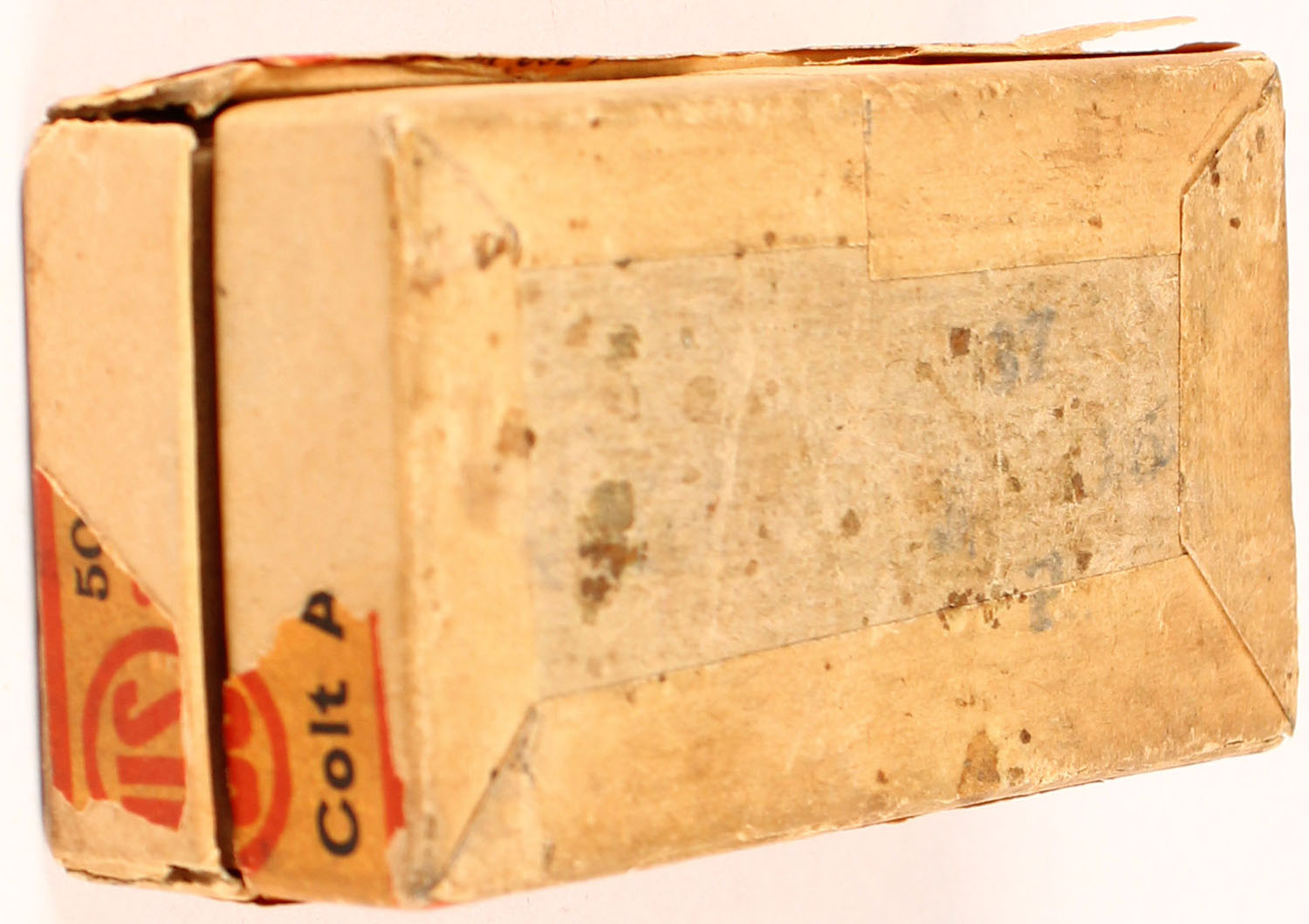 U.S. Cart. Co., .25 Colt Automatic, Smokeless, Central Fire, Metal Cased Bullet, 2pc, Full, orange box with red/black print, box has one detached end flap on lid, multiple torn seams, rub marks, edge wear & age soiling, ammo is excellent. Grade: Very Good + - Value: 24 to 200
