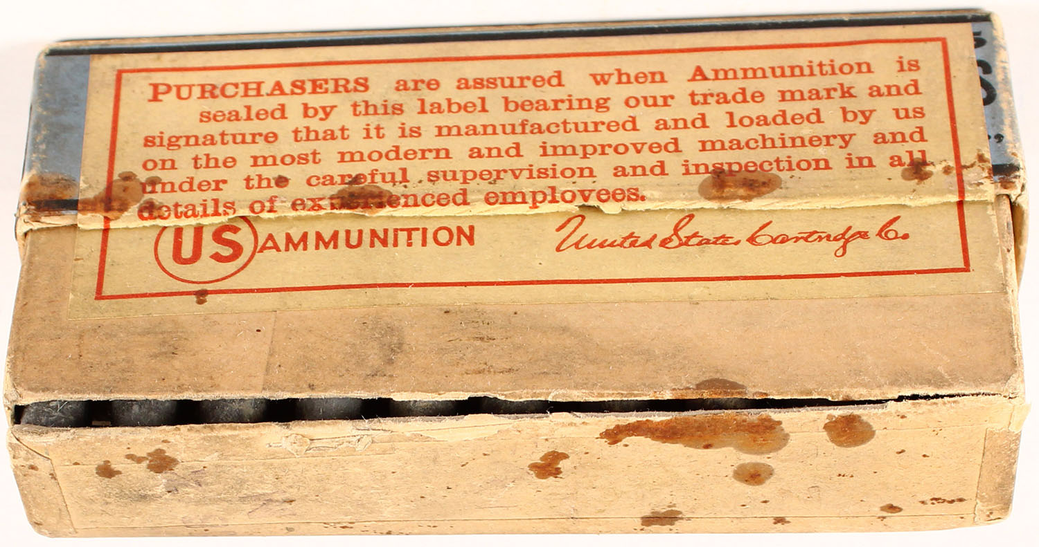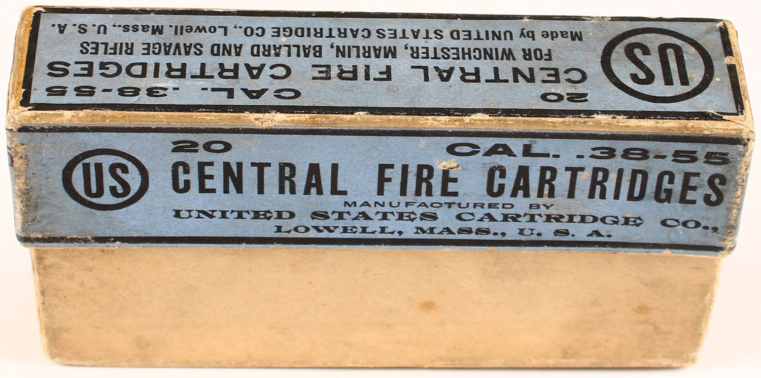 U.S. Cart. Co., .38-55, black powder, 2pc, Full, buff box with blue label & black print, box has two split seams on bottom, light age soiling, light rub marks, & light edge/corner wear, ammo ranges from very good to fair. Grade: Very Good ++ - Value: 40 to 120