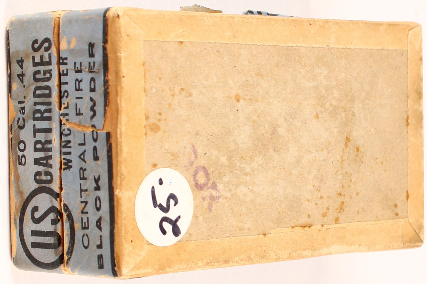 U.S. Cart. Co., .44 cartridges for Winchester rifle model 1873 (44-40), black powder, 2pc, Empty, filled with Wrong H/S ammo, buff box with blue label & black print, box is solid with rub marks, pieces of label missing, & edge/corner wear. Grade: Very Good + - Value: 20 to 100