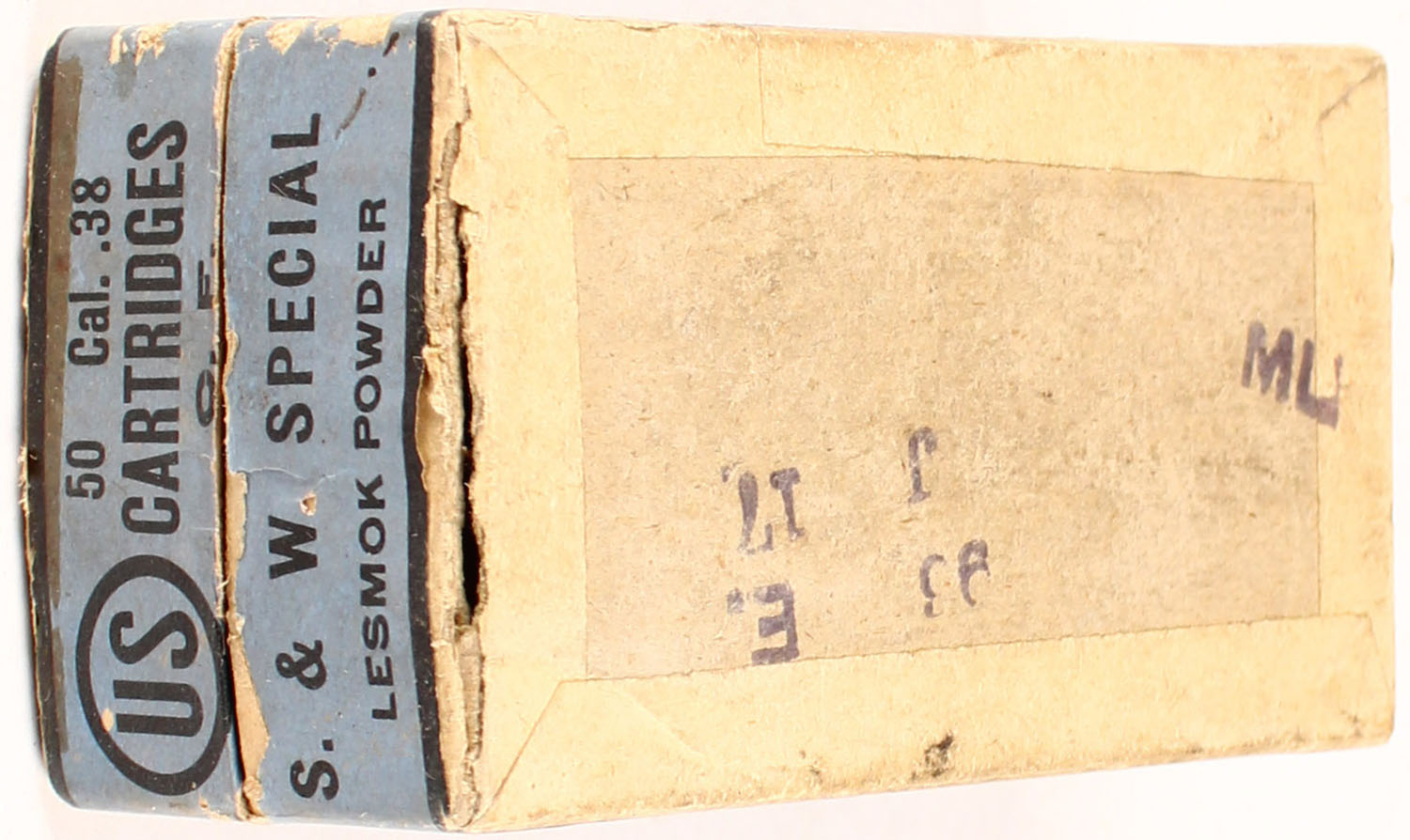 U.S. Cart. Co., .38 S. & W. Special, central Fire, Lesmok Powder, 2pc, Partial 49 Rds., buff box with blue label & black print, box has one split seam on lid, one partial seam on bottom, stains, age soiling, rub marks & edge wear, ammo ranges from very good to good. Grade: Very Good + - Value: 10 to 60