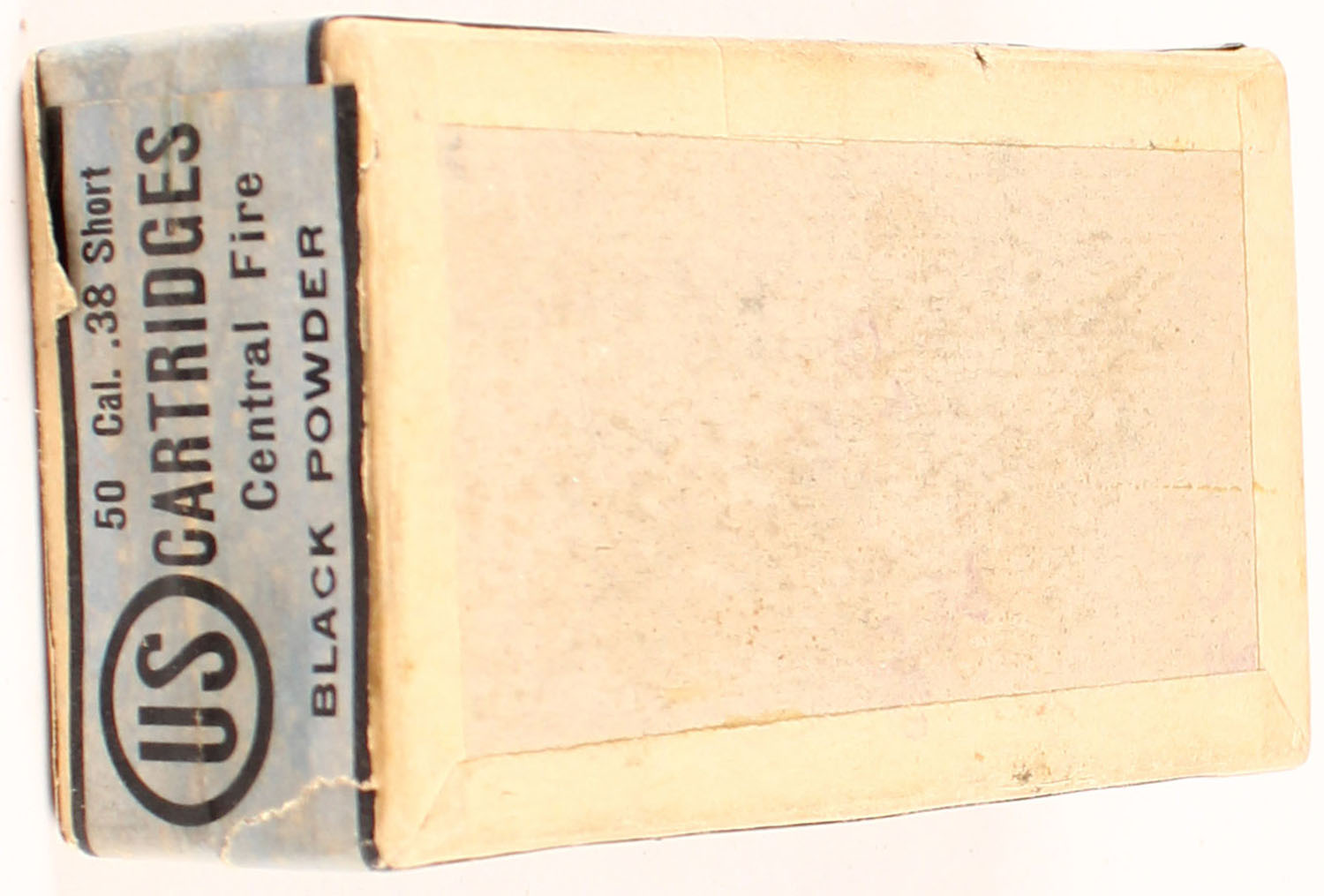 U.S. Cart. Co., .38 Short Central Fire, Black powder, 2pc, FULL & SEALED, buff box with blue label & black print, box is solid with light age soiling, rub marks & edge wear. Grade: Excellent - Value: 50 to 100