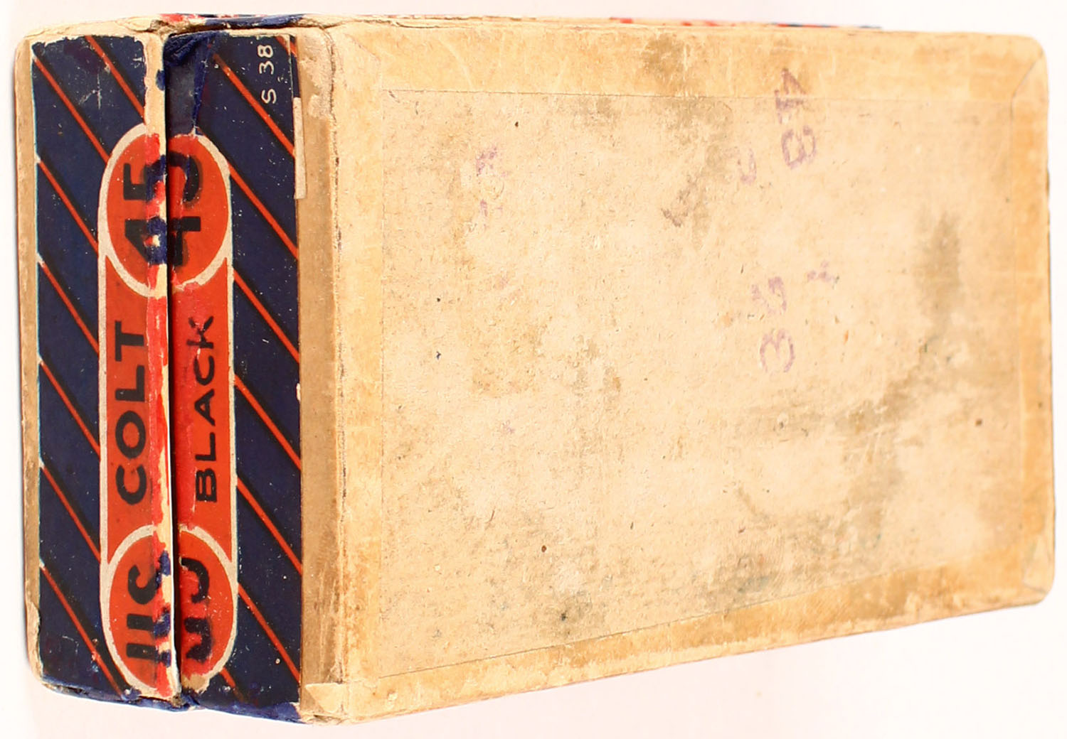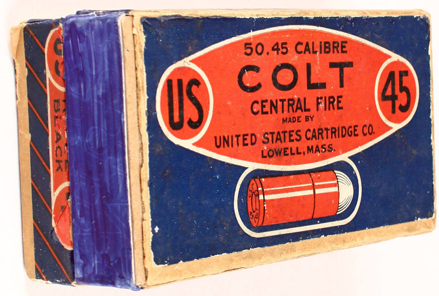U.S. Cart. Co., .45 Colt, Black powder, 2pc, Full, buff box with blue/orange label & black print, box has replaced left end of lid, paint repairs to some parts of label, light age soiling, rub marks, & edge/corner wear, ammo ranges from very good to good. Grade: Very Good - Value: 30 to 90