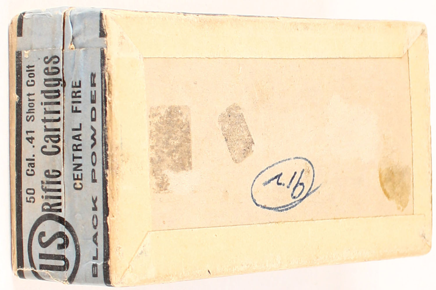 U.S. Cart. Co., .41 Short Colt, Black Powder, 2pc, Full, buff box with blue/orange label & black print, box is solid with pen marks on back, one split corner seam on lid, front side label seal still intact, light rub marks, & light edge/corner wear, ammo is good. Grade: Excellent - Value: 30 to 120