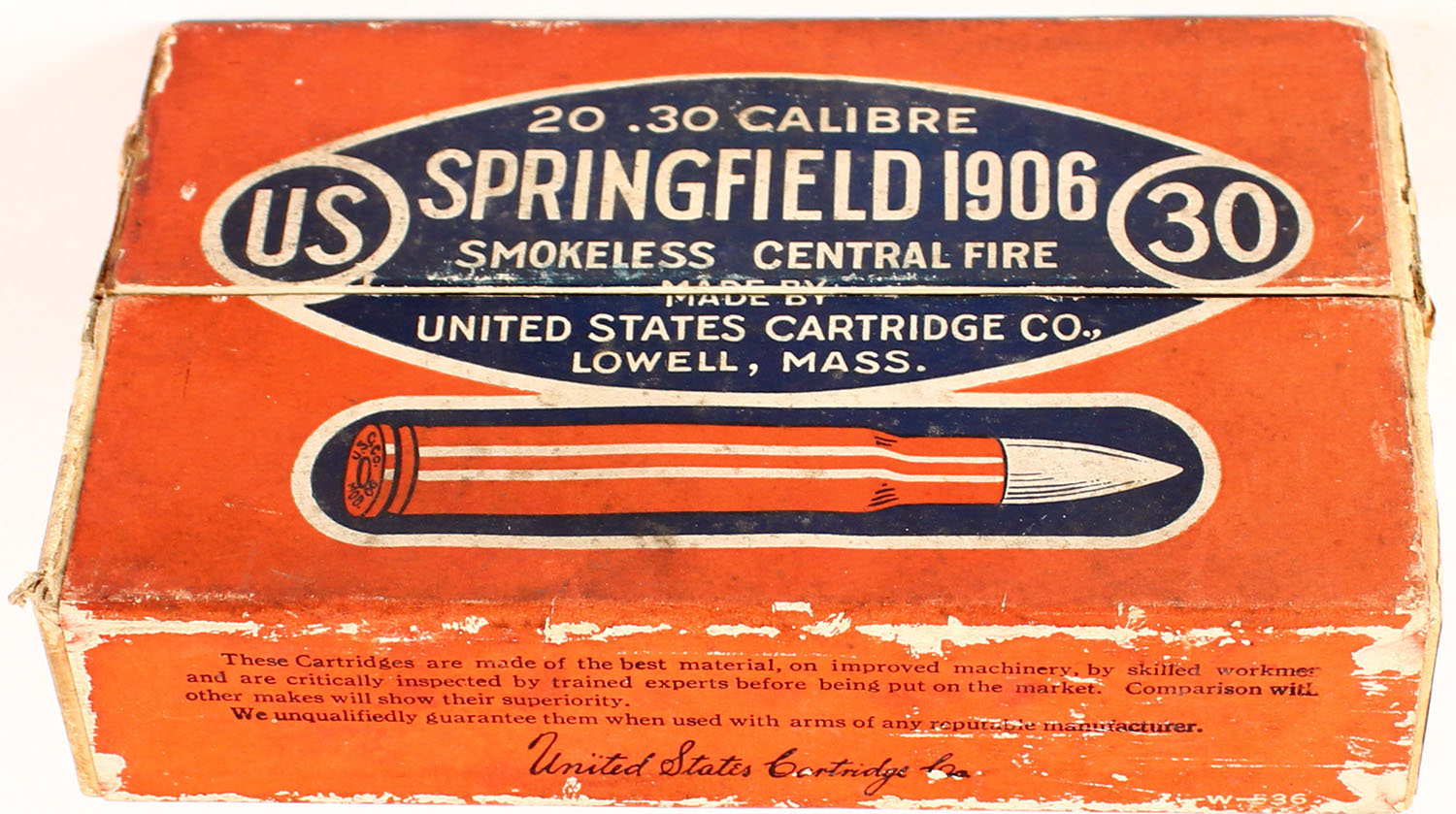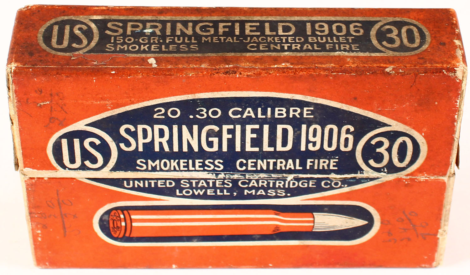 U.S. Cart. Co., .30 Calibre Springfield 1906, smokeless, Central Fire, 150 Gr. FMJ, 2pc, Full, orange box with blue/white label, box is solid with age soiling, pencil marks, one end label is missing, rub marks & edge wear. Ammo ranges from excellent to fair with some case having cracks at neck. Grade: Very Good + - Value: 20 to 60