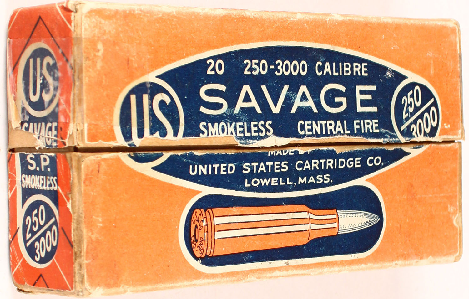 U.S. Cart. Co., .250-3000 Savage, Smokeless, Central Fire, Soft Point Bullet, 2pc, Full, orange box with blue/white label, box is solid, label has color fading, light age soiling, light rub marks & light edge wear, ammo is very good. Grade: Very Good ++ - Value: 40 to 200