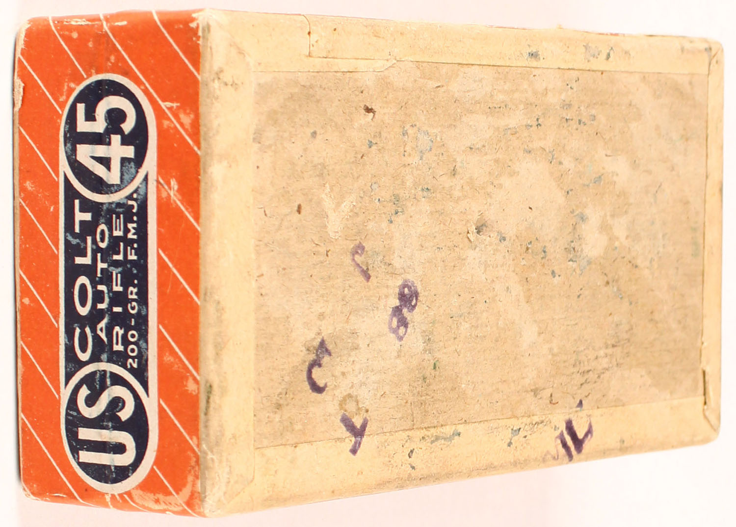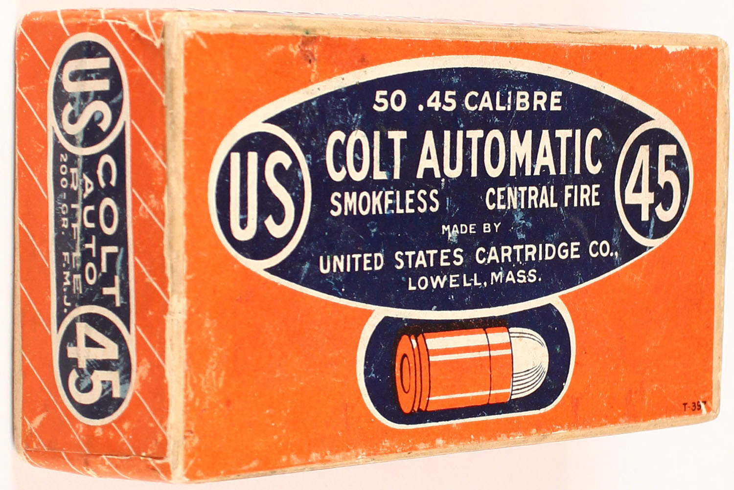 U.S. Cart. Co., .45 Colt Automatic, 200 Grain, Smokeless, Full & Sealed, 2pc. Orange, white & blue labels, box is solid with some scuffing, some shelf wear. Grade: Very Good ++ - Value: 40 to 90