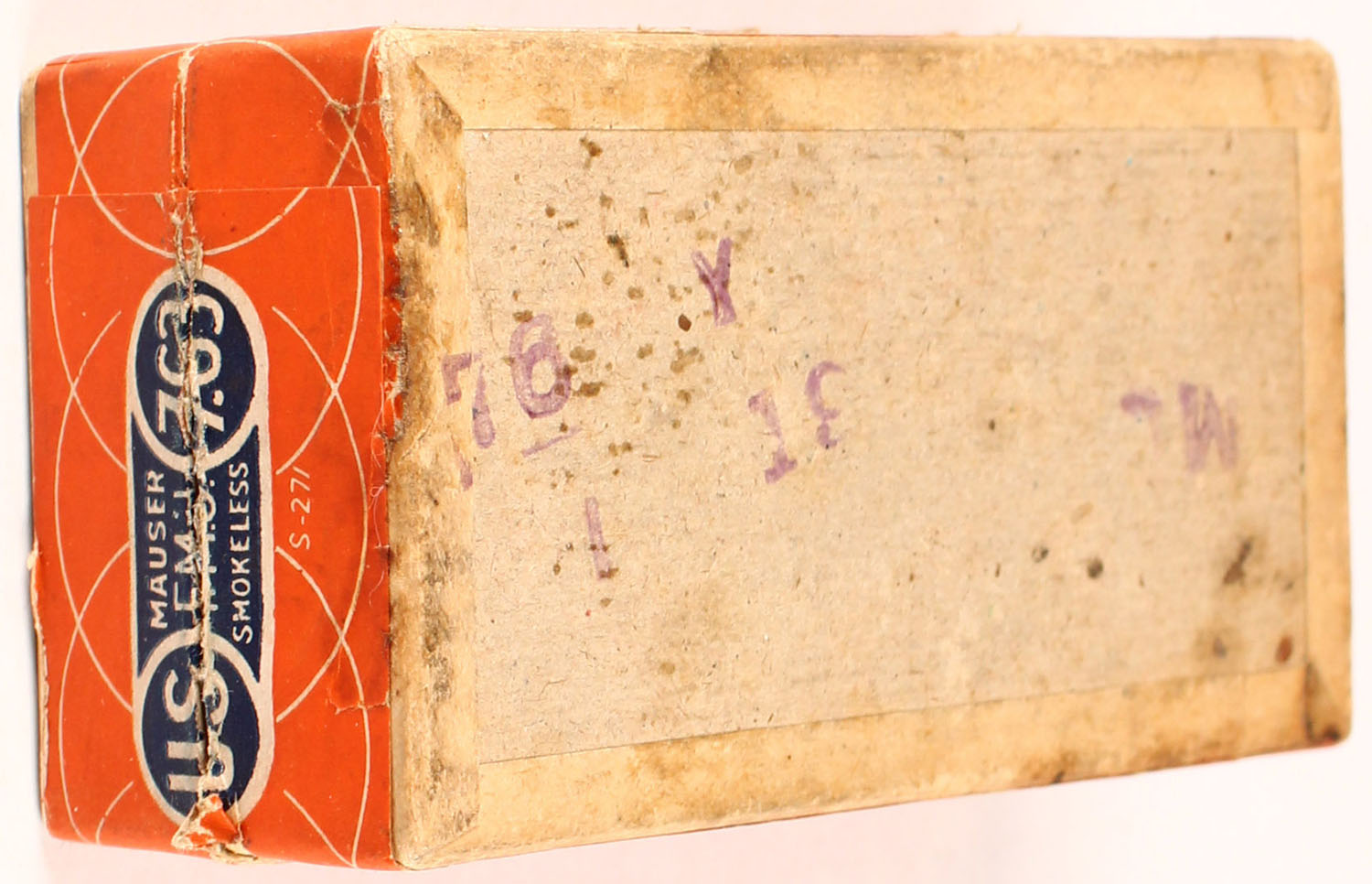 U.S. Cart. Co., .7.63 cal. Mauser, Smokeless, Central Fire, 2pc, Full, buff box with orange/blue/white label, box has scuffing and age soiling, ammo is excellent. Grade: Excellent - Value: 30 to 90