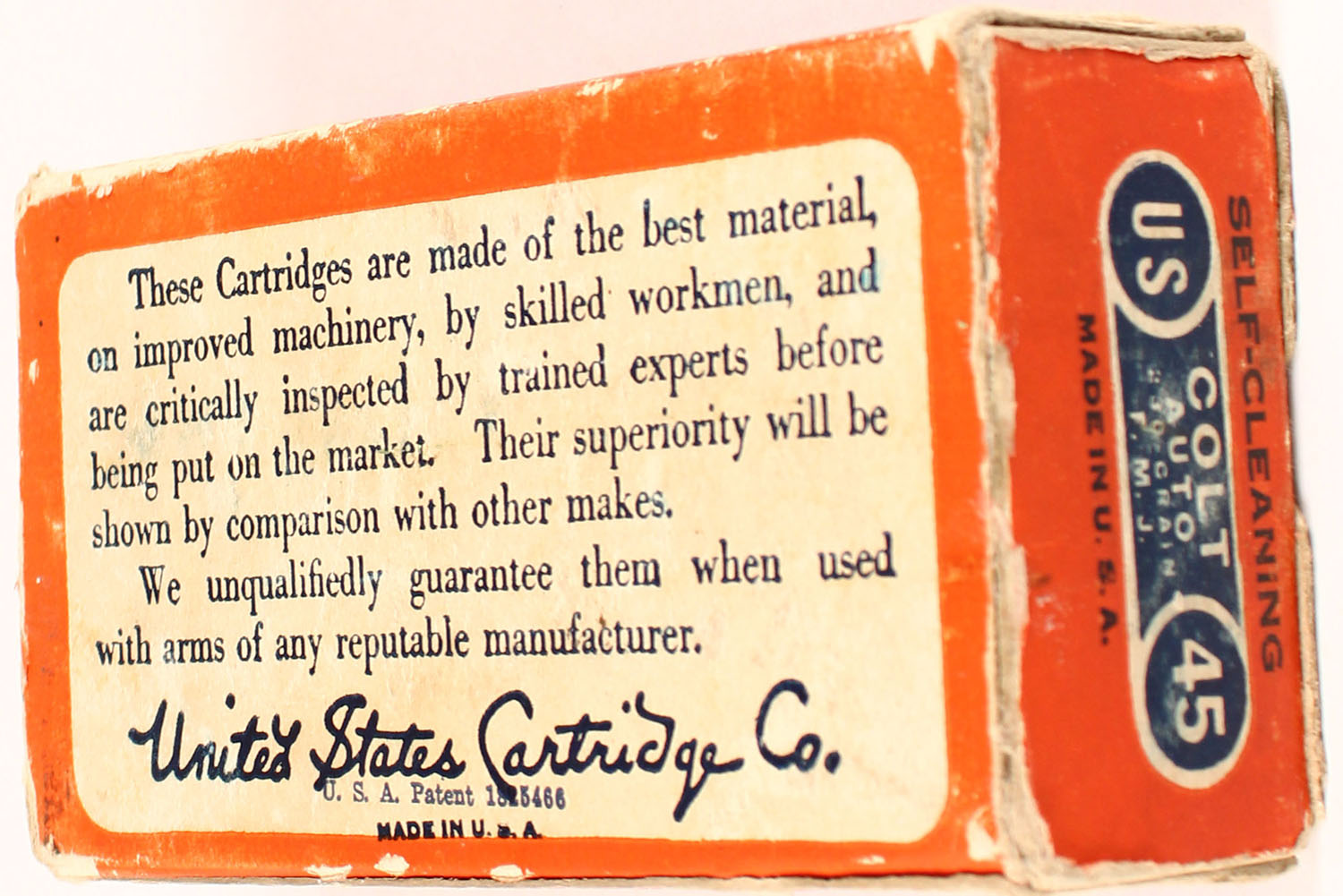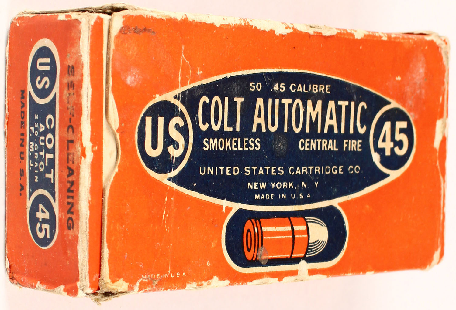 U.S. Cart. Co., .45 Colt Automatic, Smokeless, Central Fire 230 Gr. Bullet, 1pc, Full, orange box with blue/white label & black print, box is solid with light age soiling, handling marks, rub wear & edge wear, ammo is very good. Grade: Very Good - Value: 30 to 90