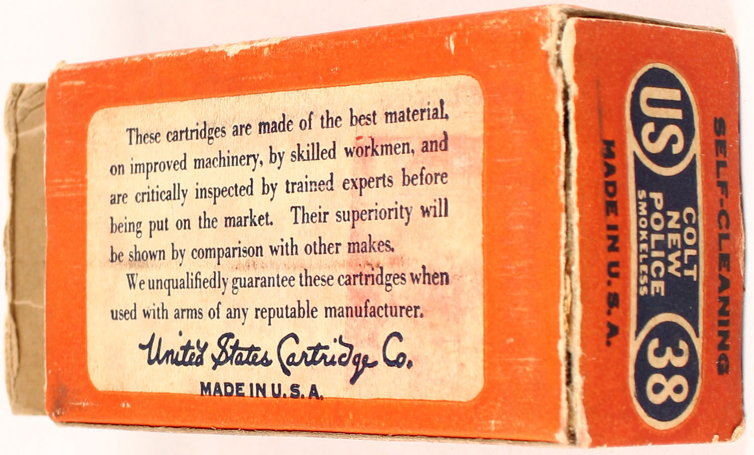 U.S. Cart. Co., .38 Cal. Colt New Police, Smokeless, Central Fire, 1pc, Full, orange box with blue/white box, box has 2 end flap detached, and some light scuffing, ammo is very good. Grade: Very Good - Value: 30 to 90
