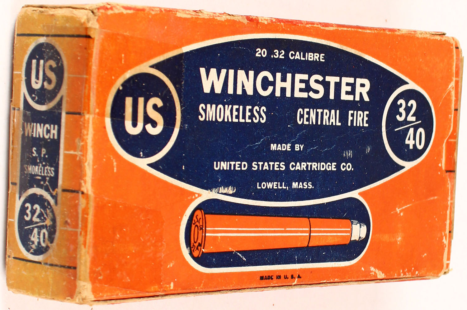 U.S. Cart. Co., .32 Winchester, Smokeless, Central Fire, 1pc, Full, orange box with blue/white box, box has both end flaps taped on, some scuffing and age soiling, ammo is very good. Grade: Very Good - Value: 20 to 80