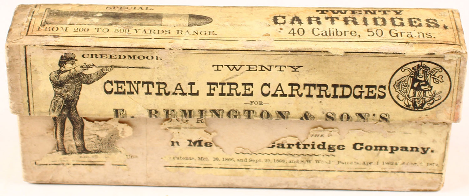 UMC, .40 cal. 50 grains, Dog Head logo, Creedmoor, FULL, 2pc. Buff box with yellow and black label, box has age soiling and scuffing, ammo is very good. Grade: Very Good - Value: 100 to 500