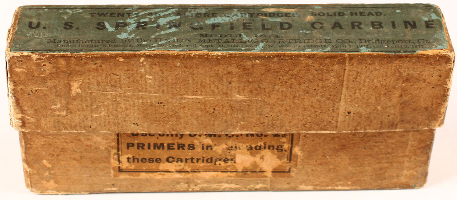 UMC, U.S. Springfield Carbine, .45 cal. Solid Head, Full, 2pc buff box with dark blue & black label, box and labels have age soiling, small seam splits and scuffing, ammo is excellent. Grade: Very Good - Value: 50 to 300
