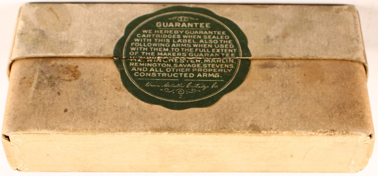 UMC, .45-70 cal. Government, Full, SHOT CARTRIDGE overlabel,, wood sabot shot cart., 2pc buff box with green & black label, box is solid and labels have age soiling, and scuffing, ammo is excellent. Grade: Very Good ++ - Value: 100 to 400