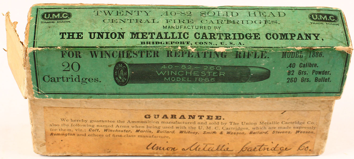 UMC, .45-82 cal., Full, 2pc., buff box with green & black label, box has seam splits to top and labels have age soiling, and scuffing, ammo is very good. Grade: Very Good - Value: 50 to 150