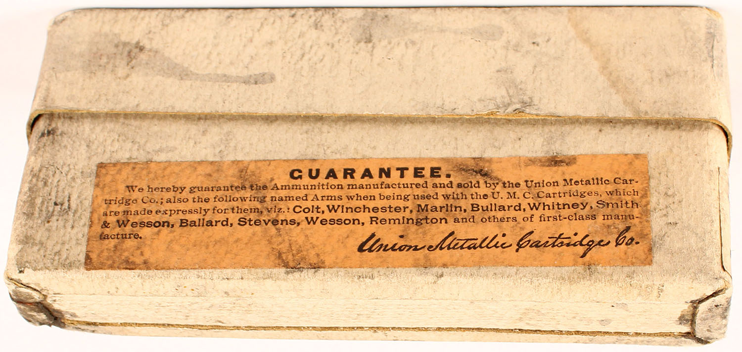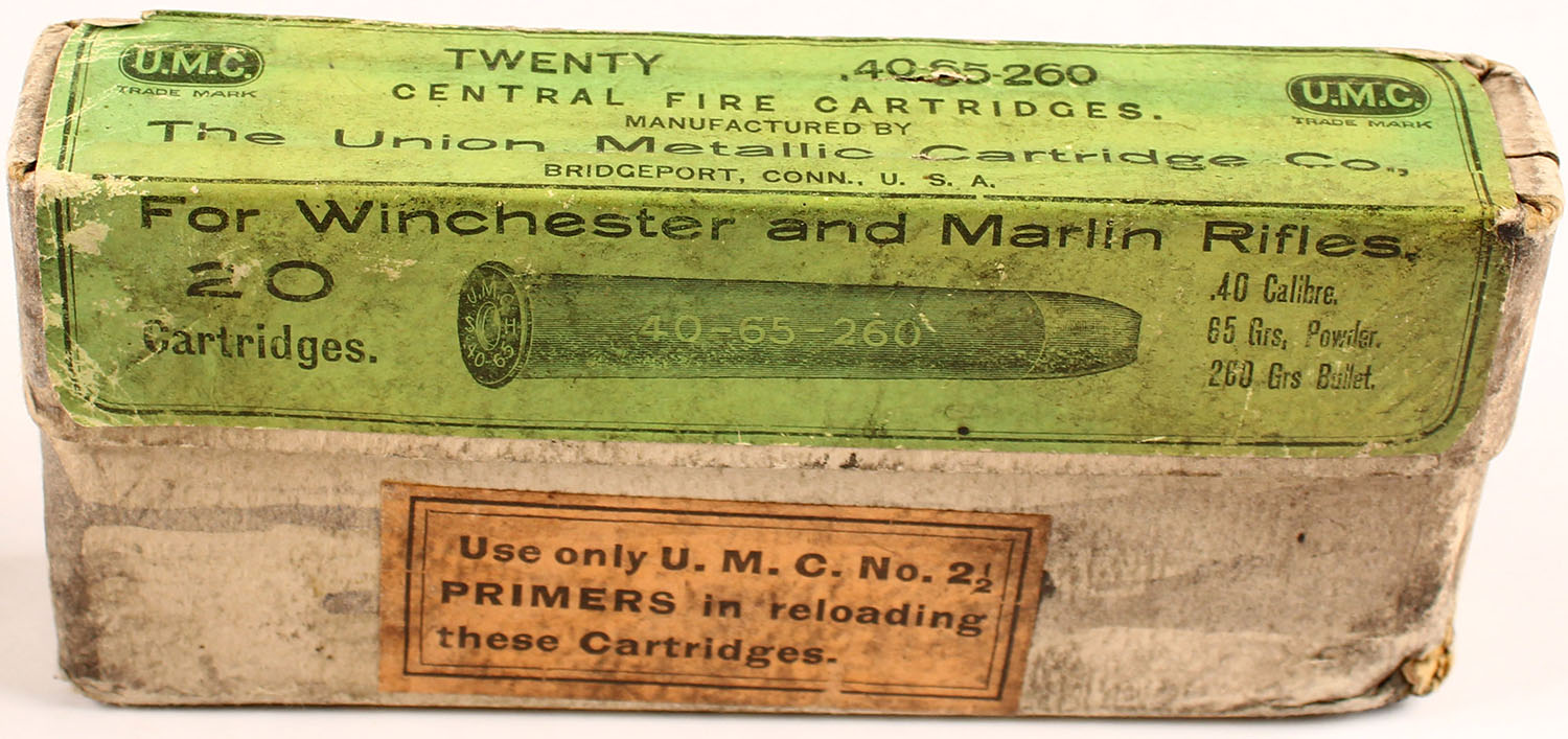 UMC, .40-65-260 cal., Full, 2pc., buff box with green & black label, box has age soiling and 1 corner ding, label has scuffing and age soiling, ammo is very good. Grade: Very Good - Value: 40 to 150