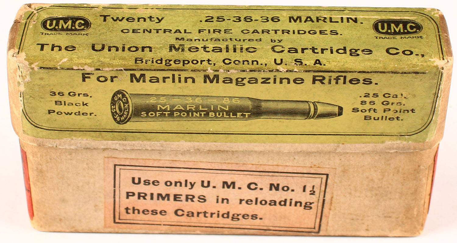 UMC, .28-30-120 cal., 120 grs. bullet, Full & Sealed, 2pc., buff box with green & black label, box has age soiling and labels have minor scuffing and age soiling. Grade: Very Good - Value: 50 to 150