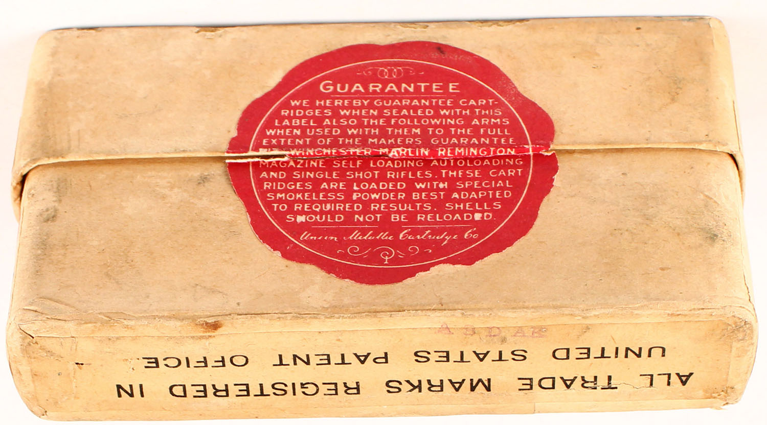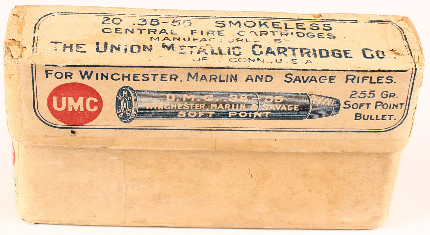 UMC, .38-55. Smokeless, Central Fire Cartridges, 2pc, Full, buff box with buff, blue and red print, box is solid with scuffing to label, ammo is excellent. Grade: Excellent - Value: 20 to 200