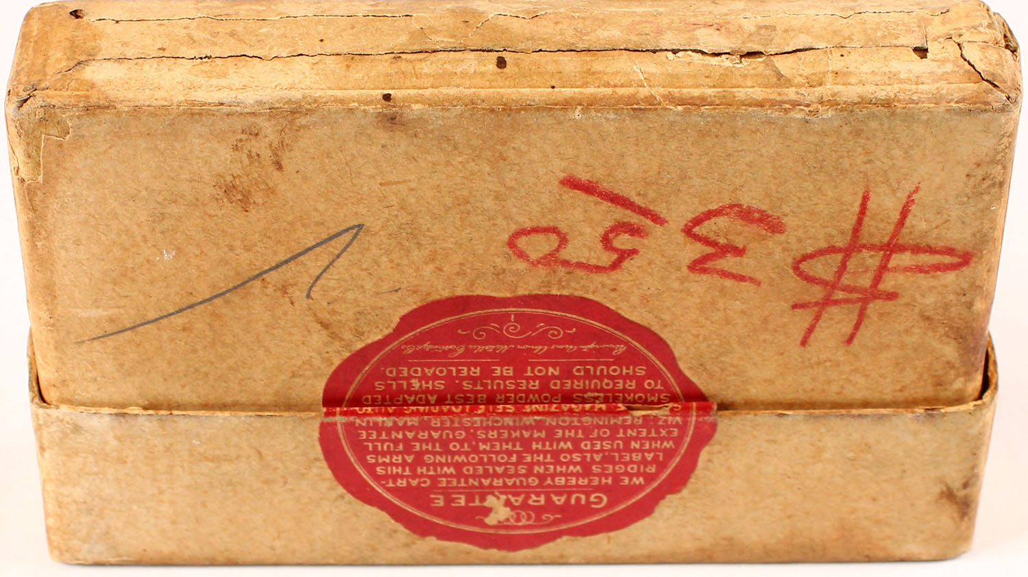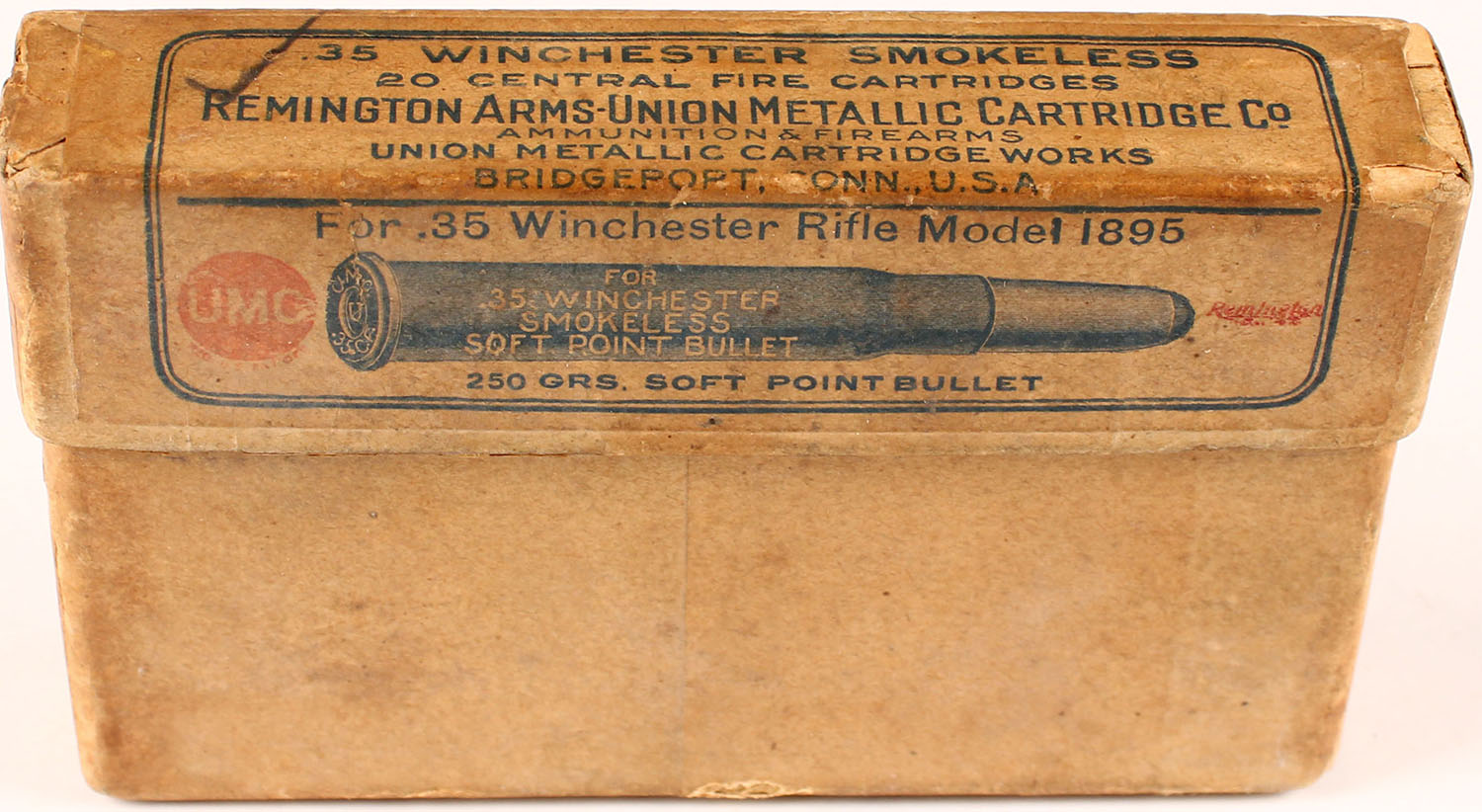 UMC, .35 Winchester, Smokeless, Central Fire Cartridges, 2pc, Full, buff box with buff and blue print, box is sold with age soiling, ammo is very good. Grade: Very Good ++ - Value: 40 to 150