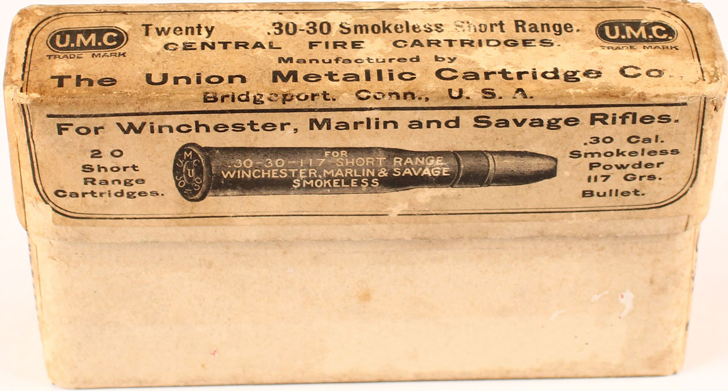 UMC, .30-30 Smokeless Short Range, Central Fire Cartridges, 2pc, Full, buff box with buff and black print, box is solid and label has scuffing and age soiling, ammo is excellent. Grade: Very Good + - Value: 40 to 100