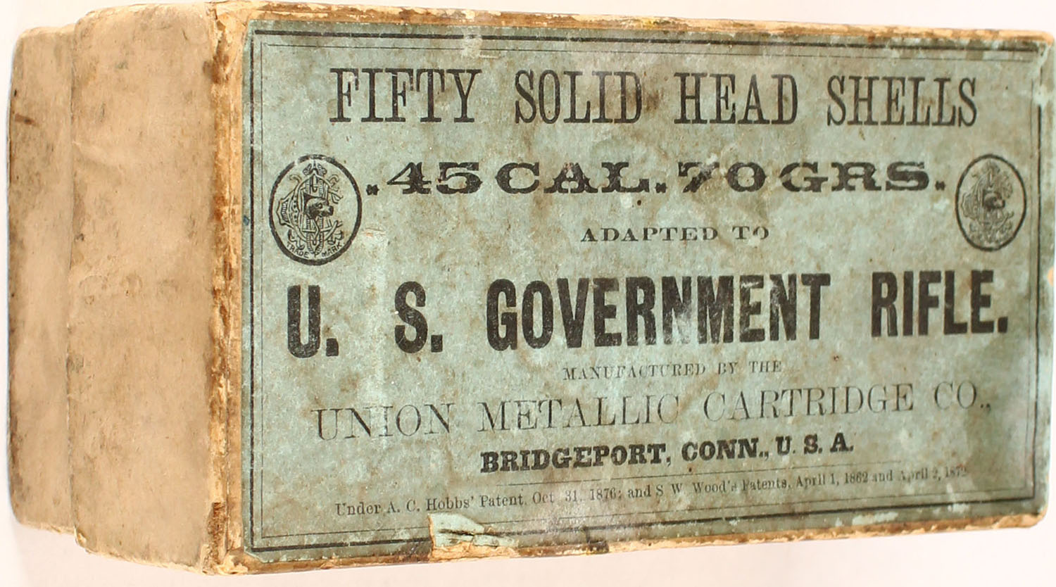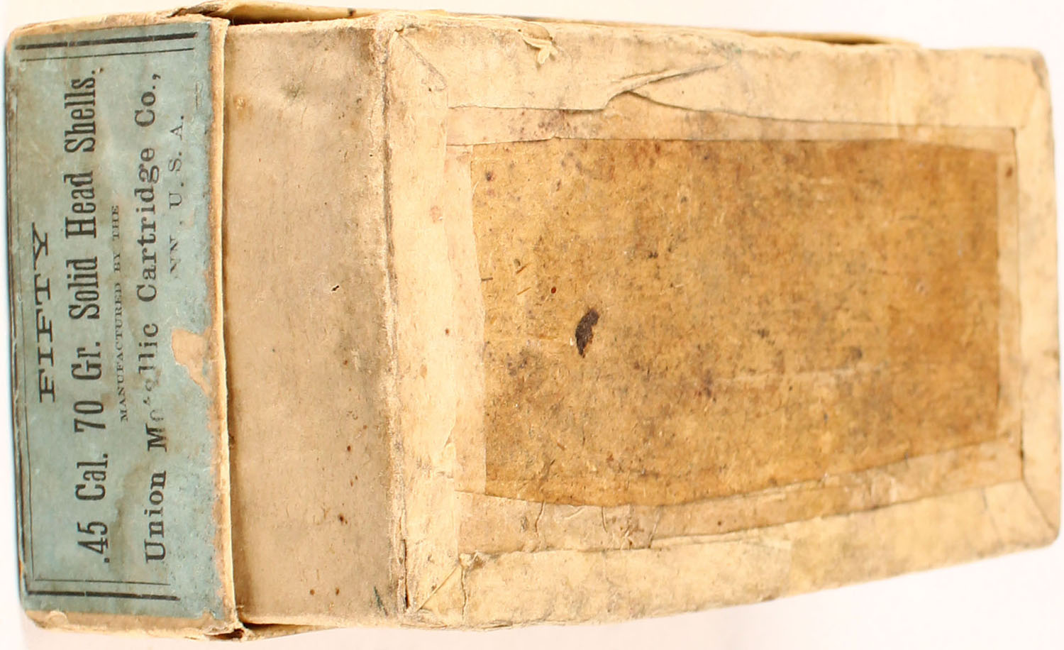 UMC, .45 cal., Dog head logo, U.S. Government Rifle, 2pc, Empty but Full of empty primed shells, buff box with blue and black print, box has age soiling and label has scuffing and age soiling, ammo is very good. Grade: Very Good - Value: 50 to 300