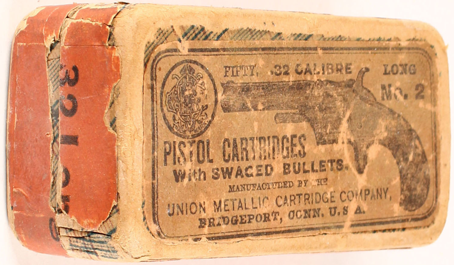 UMC, .32 Calibre Long, swaged Bullets, 2pc, Full, plaid box with tan top label and orange side label & black print, box is solid with rub marks, edge wear & corner wear, tears to labels ammo is good. (1119) Grade: Very Good - Value: 50 to 300