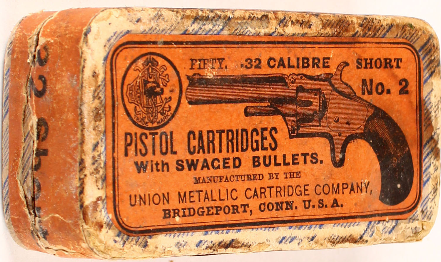 UMC, .32 Calibre Short, Dog head logo, Swaged Bullets, 2pc, Full fabric box with orange label & black print, box is solid with age stains, rub marks, edge wear & corer wear, ammo is good. (659) Grade: Very Good ++ - Value: 50 to 300
