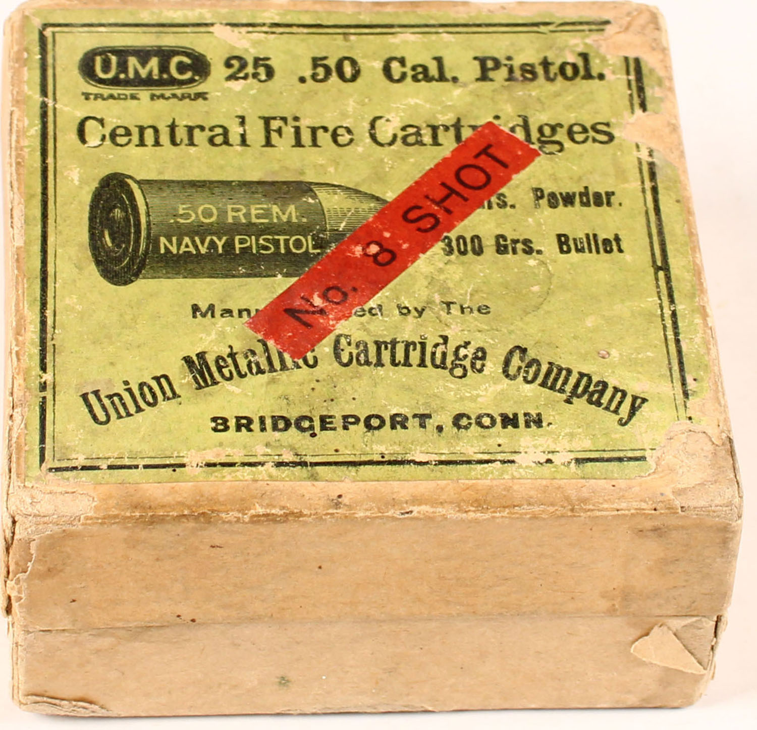 UMC, .50 Rem Navy Pistol, No. 8 SHOT, Full, 2pc. tan box with green top & no side sealing labels, box has a couple small seam splits and scuffing, ammo is good. Grade: Very Good - Value: 100 to 500