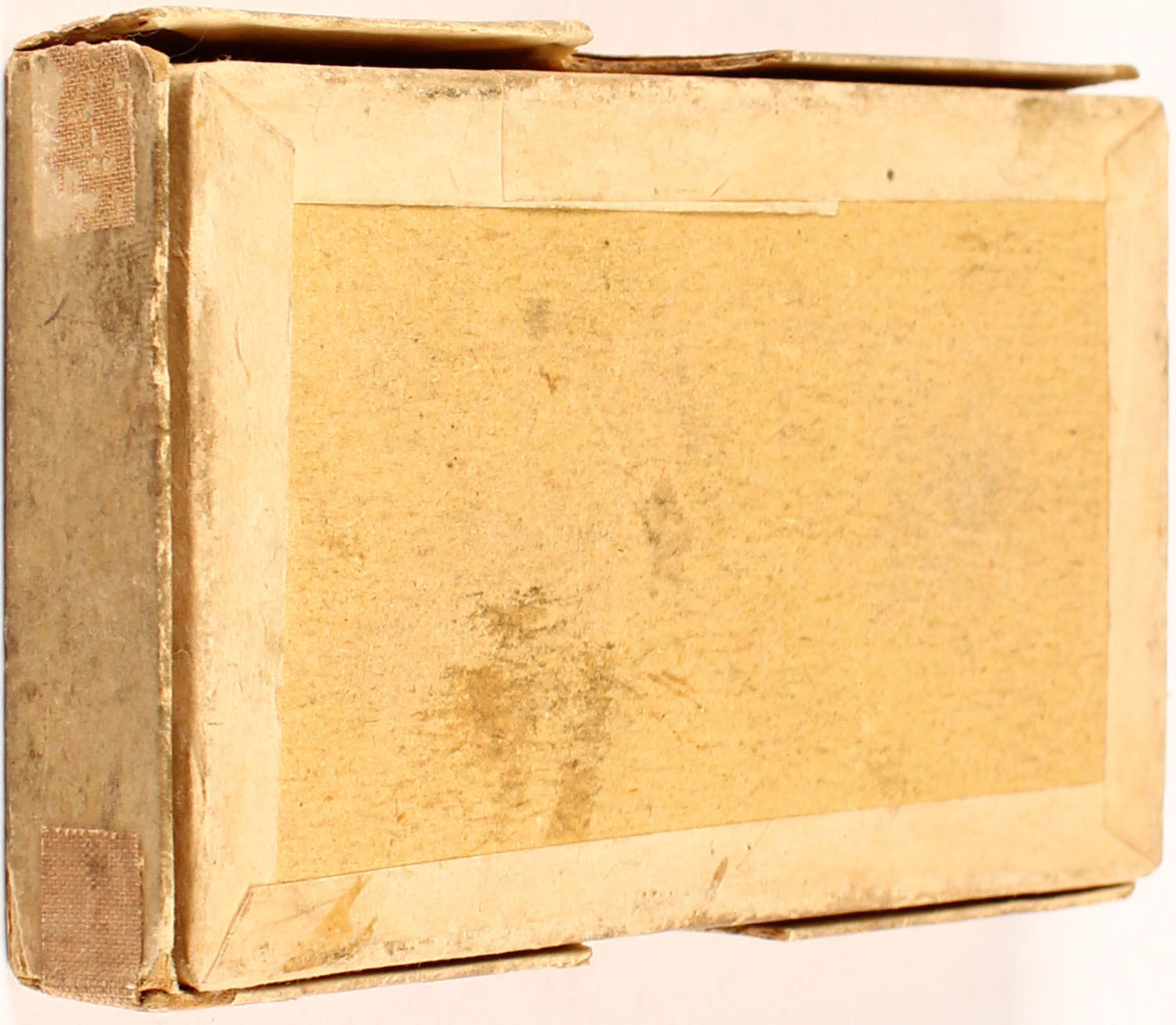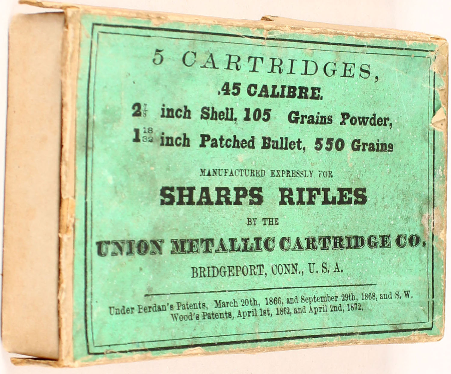 UMC, Sharps Rifle, .45 Calibre, 2 7/8 inch Shell, 105 Grains Powder, 1 18/32 inch Patched Bullet. 550 Grains., Full, 2pc. Buff box with green labels, box has 1 side missing from top and repaired seam splits to top, very minor age soiling, very minor edge & corner wear, label is intact, ammo is excellent. Grade: Very Good + - Value: 300 to 900